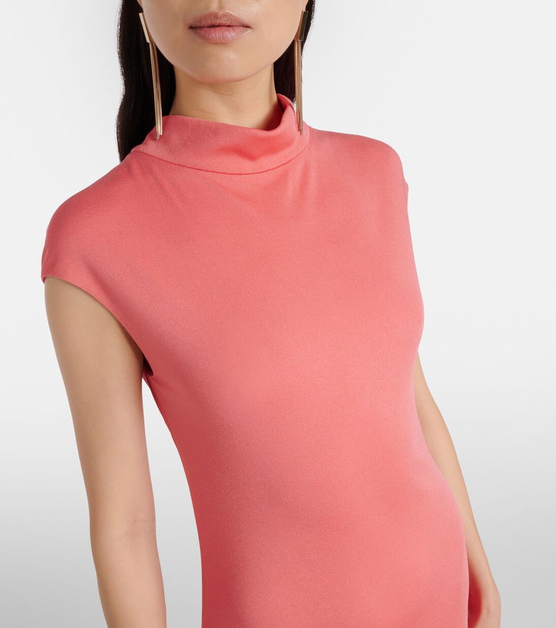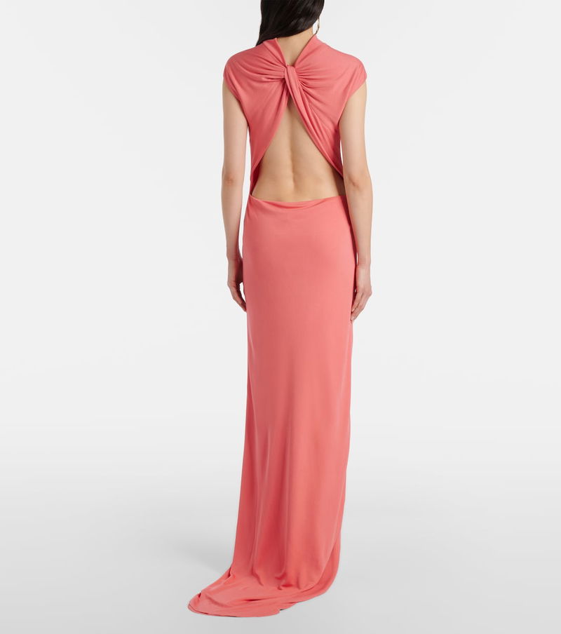 Tom Ford’s tailoring showcases meticulous attention to detail with a dose of high-octane glamour. This short-sleeved gown is cut from pink crêpe jersey with an asymmetric, high-low hem and a dramatic, knotted open back.