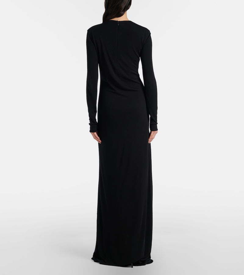 Tom Ford’s tailoring showcases meticulous attention to detail with a dose of high-octane glamour. This long-sleeved gown is cut from black crêpe jersey with an asymmetric front slash cutout and subtle gathering for a sleek finish.