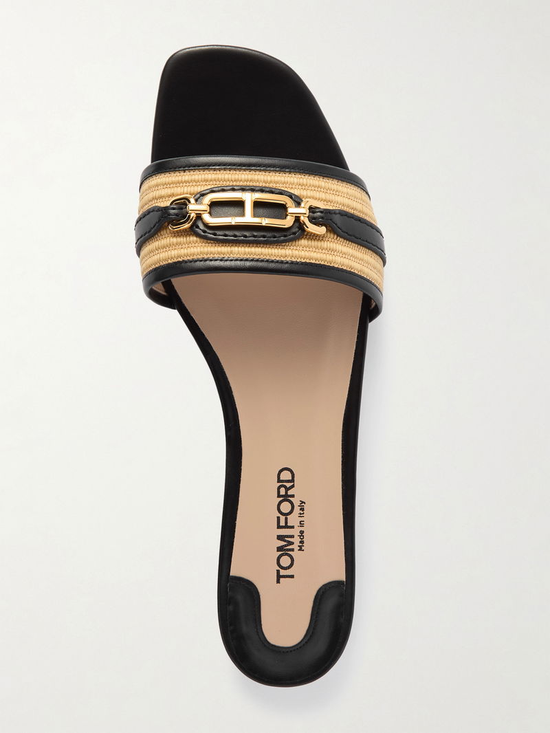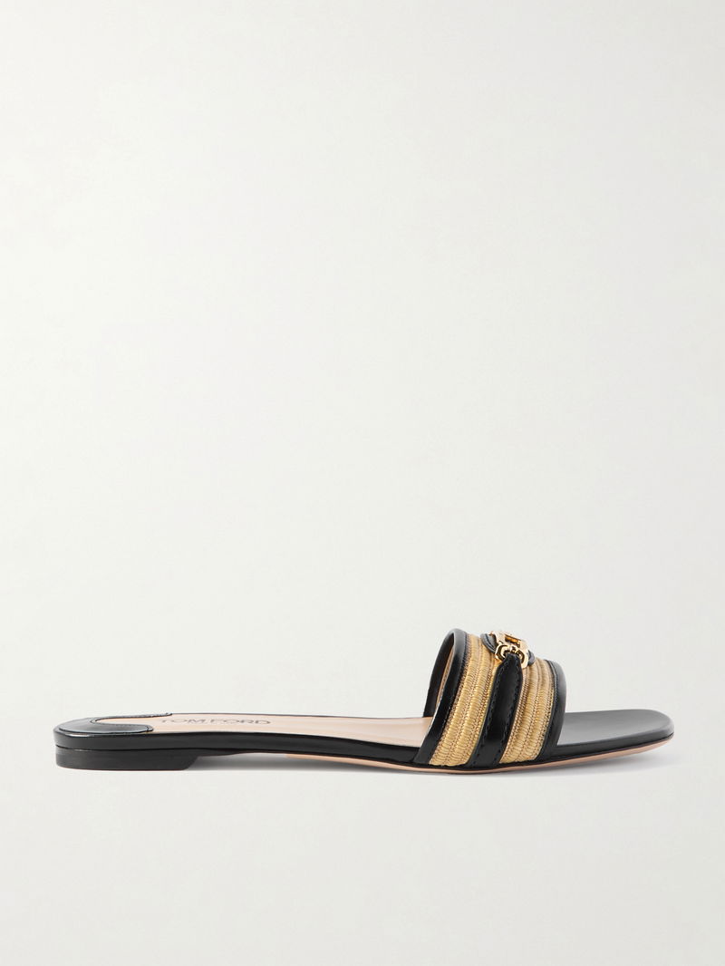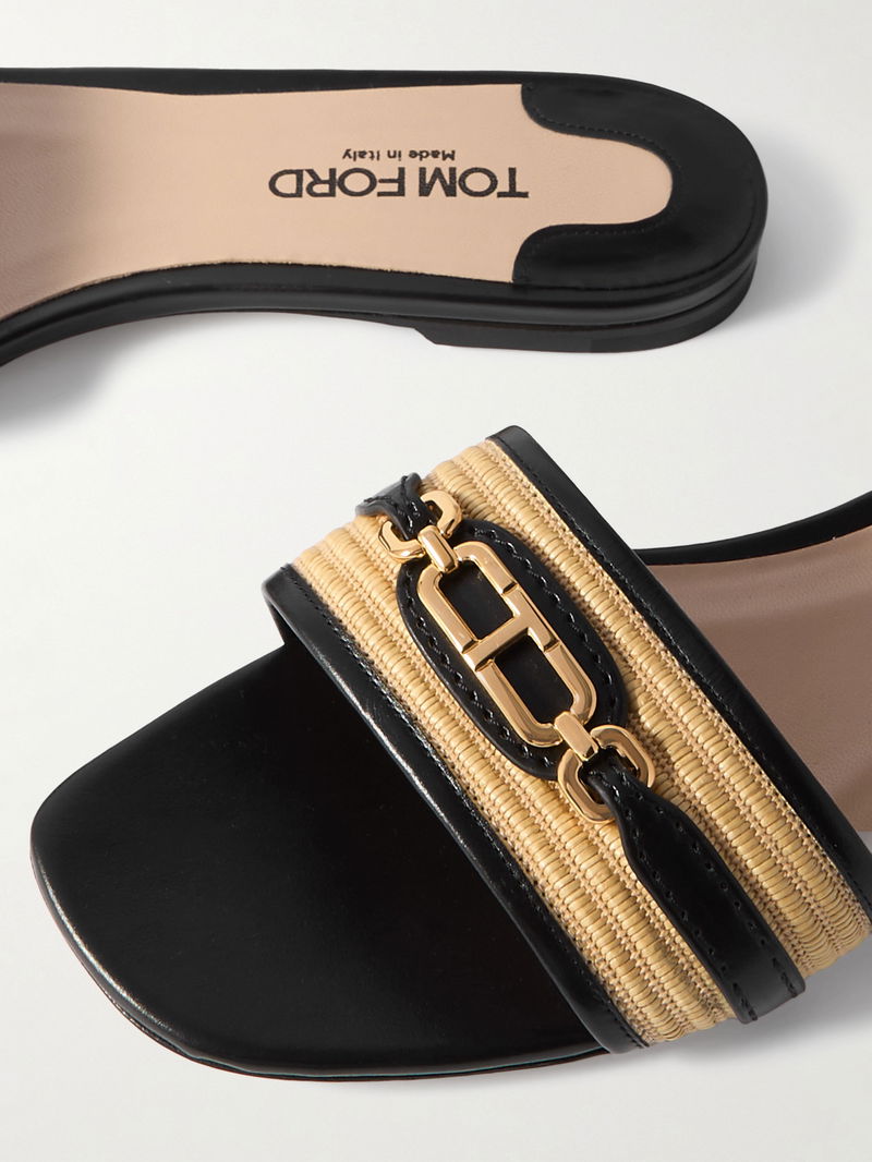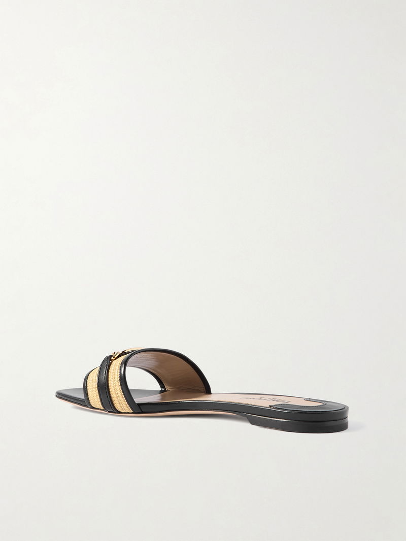 Logo-embellished Raffia-trimmed Leather Slides