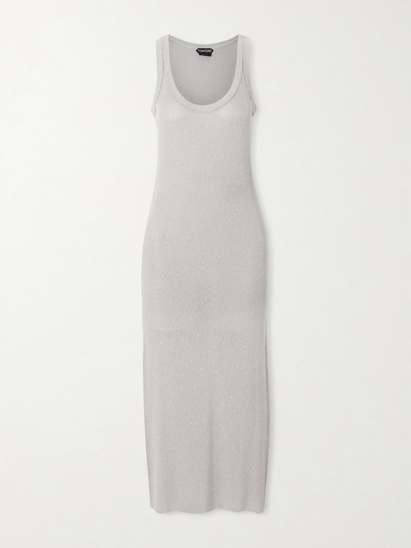 TOM FORD's dress stays true to the label's understated glamour. Made from metallic ribbed-knit, it's flecked with sequins for added sparkle and has a figure-skimming fit. Complement the deep scooped neckline with a chain.