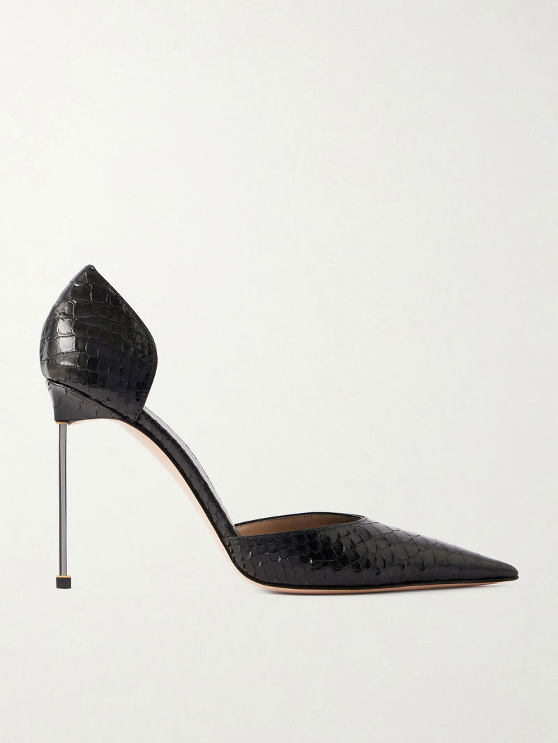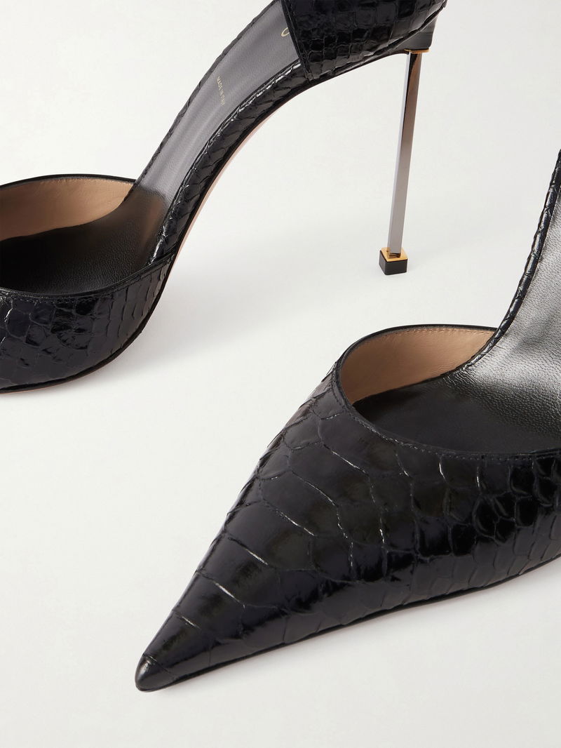 A power heel is rendered with unmistakable confidence in TOM FORD's hands. Set on a razor-sharp metal stiletto, this d'Orsay pair is crafted from tactile python-effect leather and designed to elegantly frame and flatter the foot.