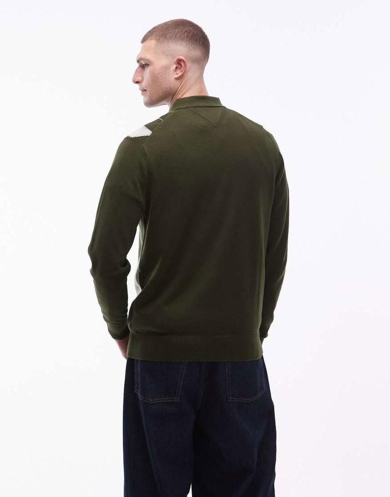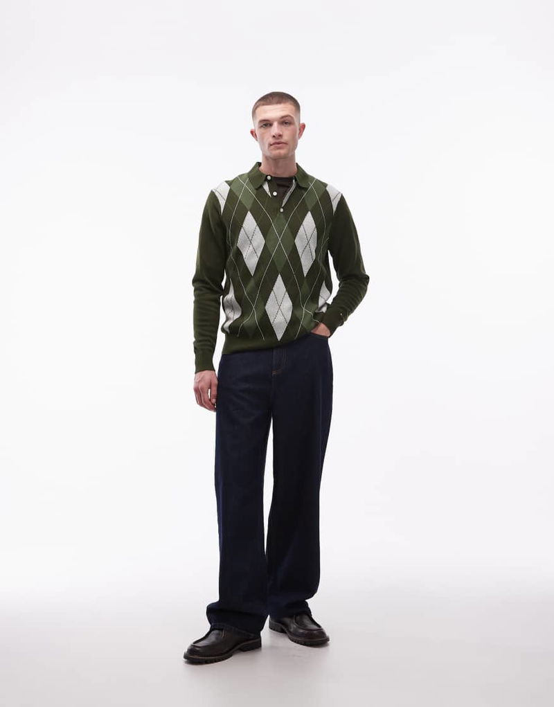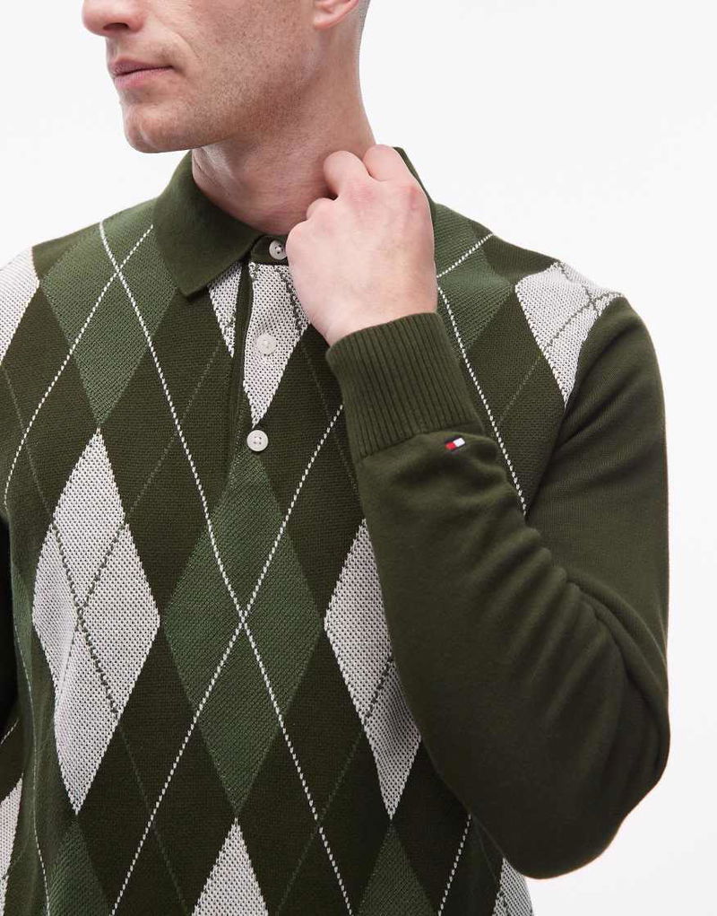 Argyle Pattern Long Sleeve Knitted Rugby Polo Shirt In Green