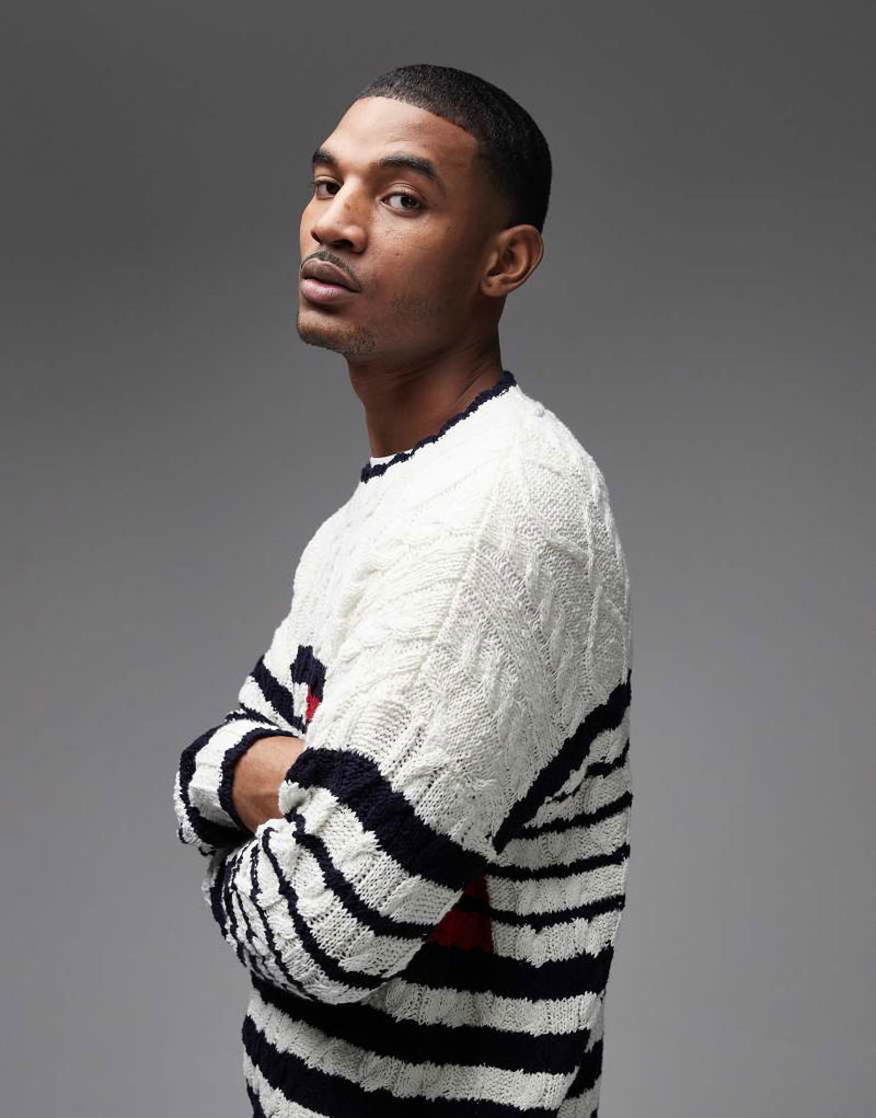 Cable Knit Breton Jumper In Cream & Navy Stripe