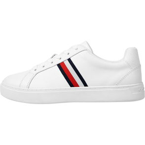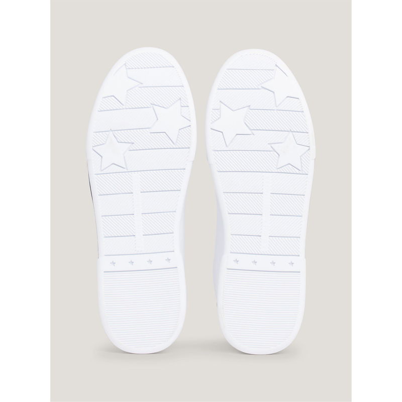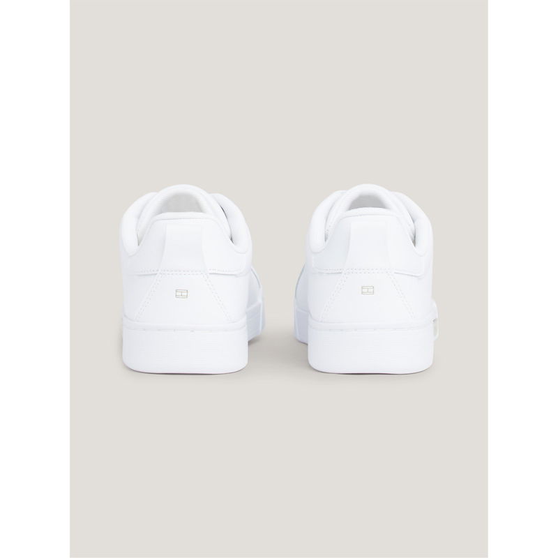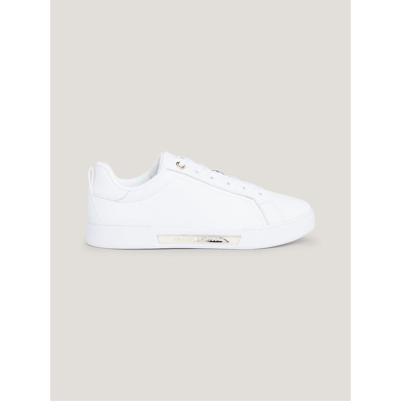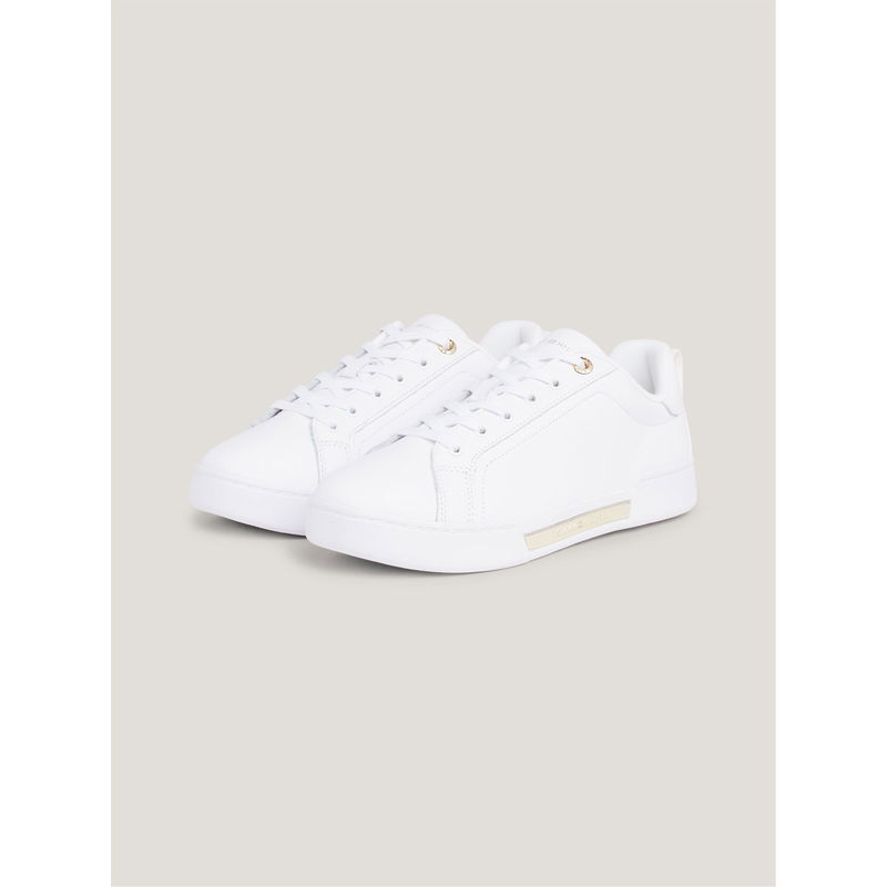 Step into the world of effortless style and iconic design with Tommy Hilfiger's Chique Court Sneakers. Crafted from 100% leather boasting comfort and quality, while the rubber outsole provides durability and traction, making these shoes perfect for every step of your daily adventures. Designed with a low top style and round toe offering versatility and a sleek silhouette, while the lace-up fastening ensures a secure and adjustable fit. With a pull tab at the heel, these trainers add a touch of convenience. Designed in a classic white hue with gold-toned detailing showcasing a high level of craftsmanship. Featuring the Tommy Hilfiger branding on the side adding a touch of sophistication, while the playful star motif on the sole provides a unique charm. Whether strolling through the city or attending a casual gathering, the Tommy Hilfiger Chique Court Sneakers are the perfect companion.
