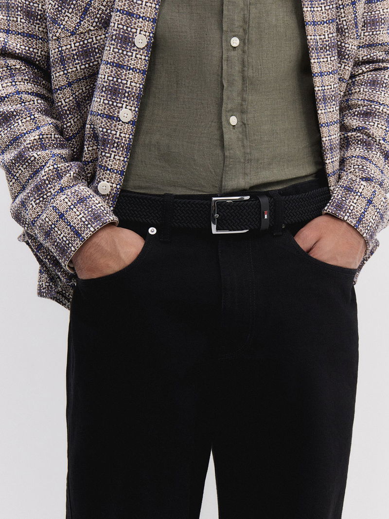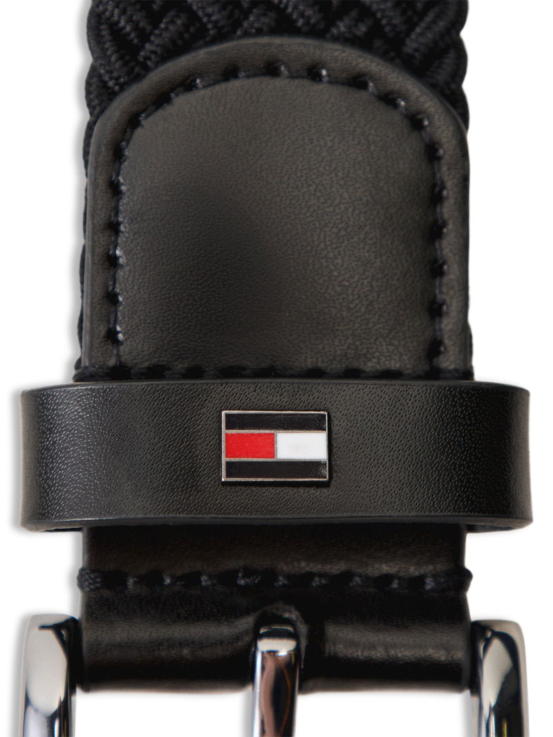The Denton Elastic Belt Black features a braided design with an adjustable pin buckle and subtle branding for a sleek, versatile look.