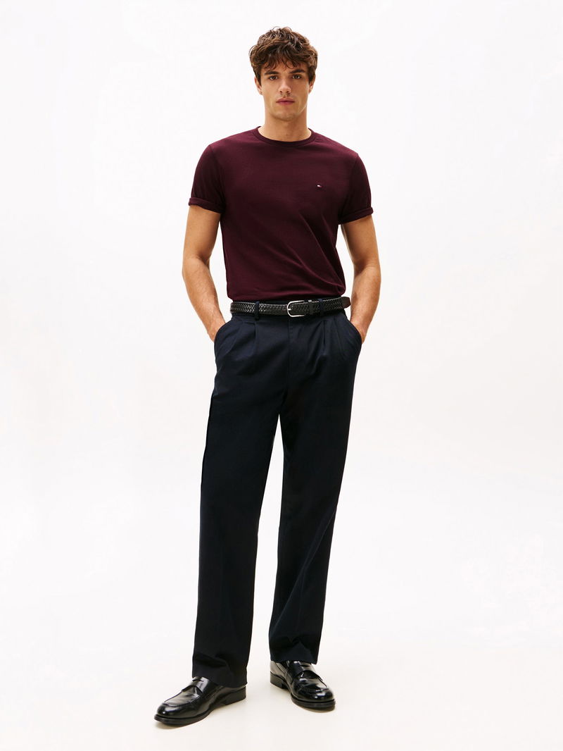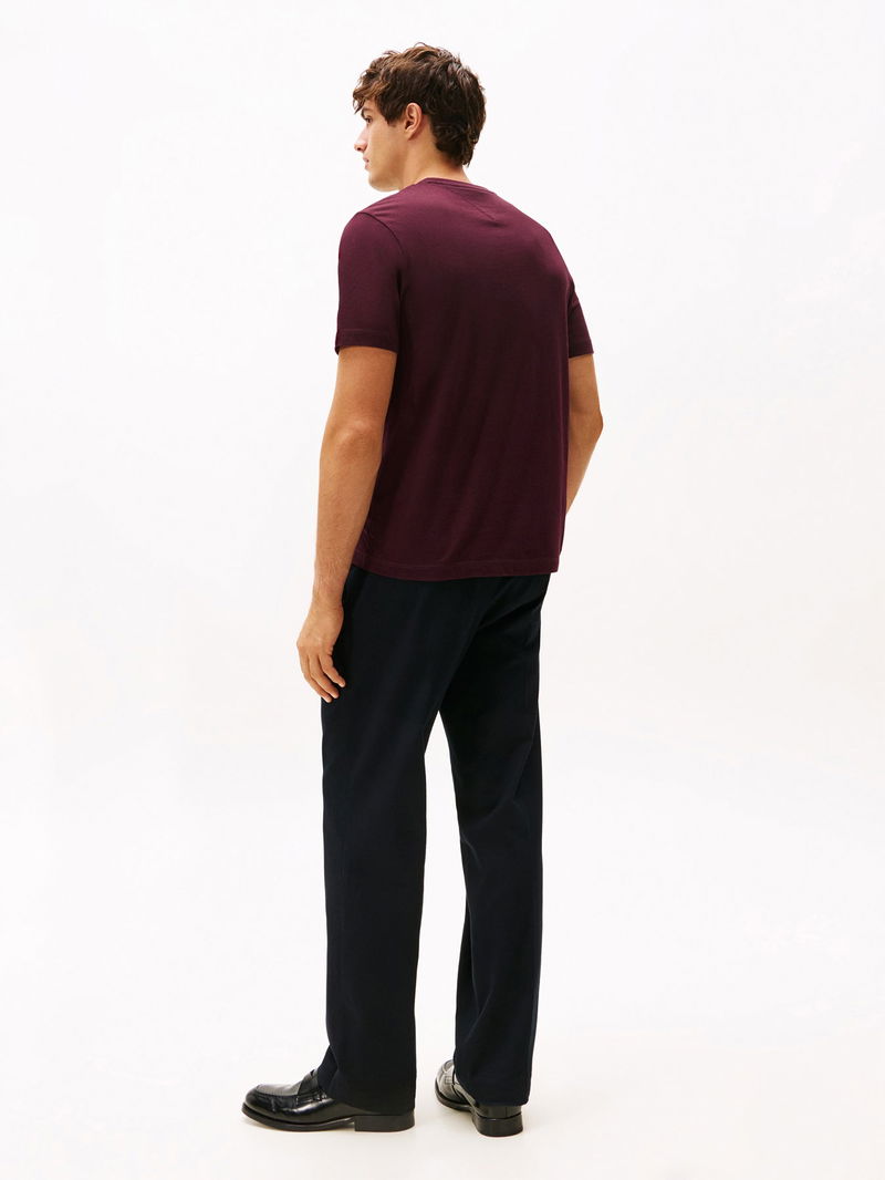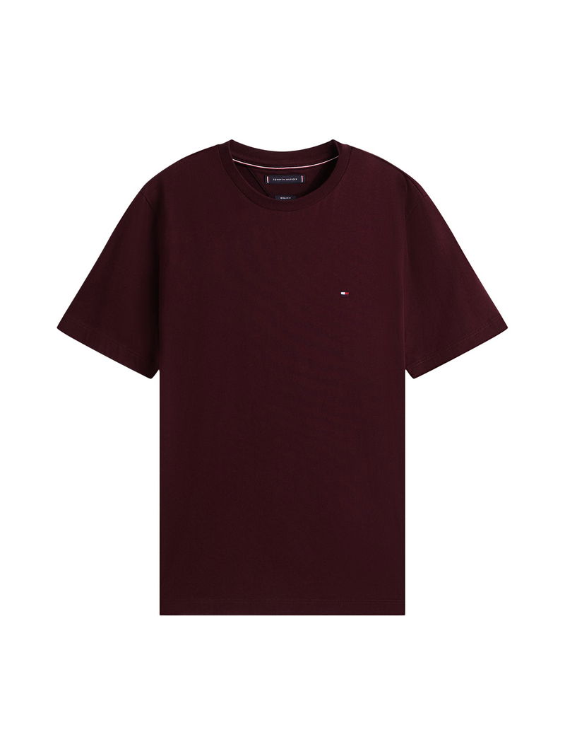 This deep burgundy crew neck t-shirt by Tommy Hilfiger features a signature flag embroidery that adds a subtle, stylish detail. Made from soft cotton, it offers comfortable wear and breathability, making it a versatile choice for everyday casual outfits. Its classic fit ensures effortless style and ease of movement.
