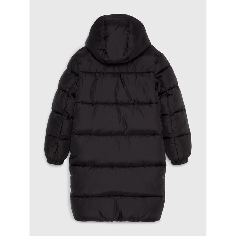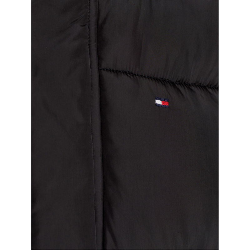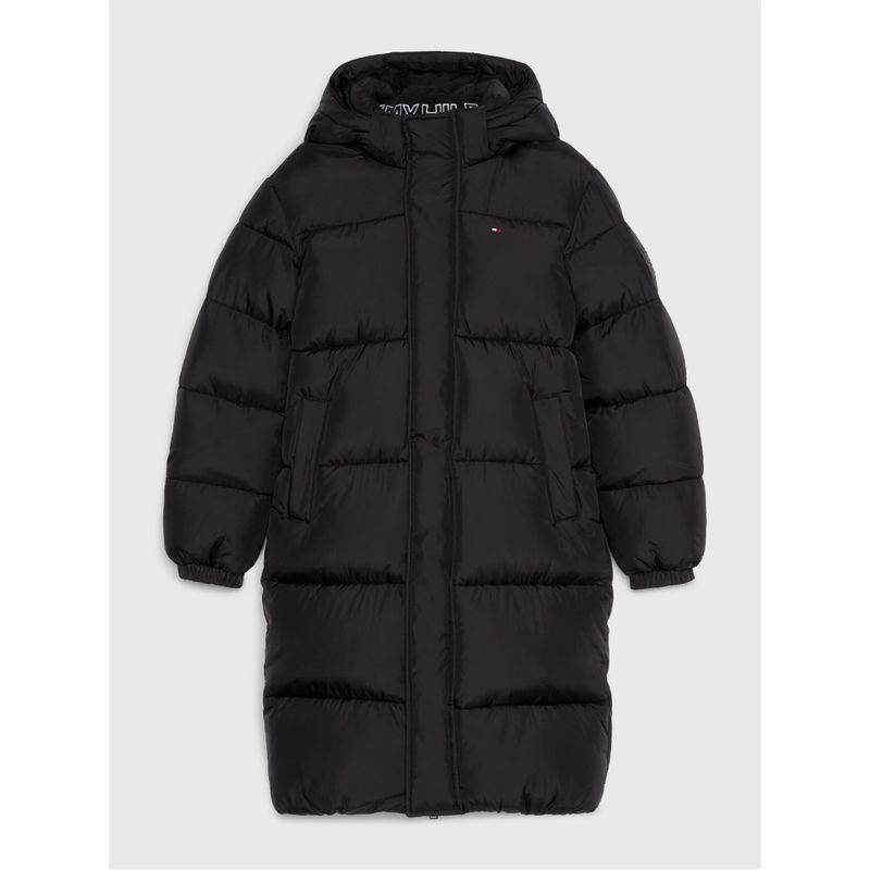 The Tommy Hilfiger Kids' Essential Padded Hooded Puffer Jacket delivers warmth with style. Featuring a practical regular fit with durable fabrication, this mid-length outerwear design includes a protective zip closure with press stud storm flap and elasticated cuffs for reliable protection against the elements.