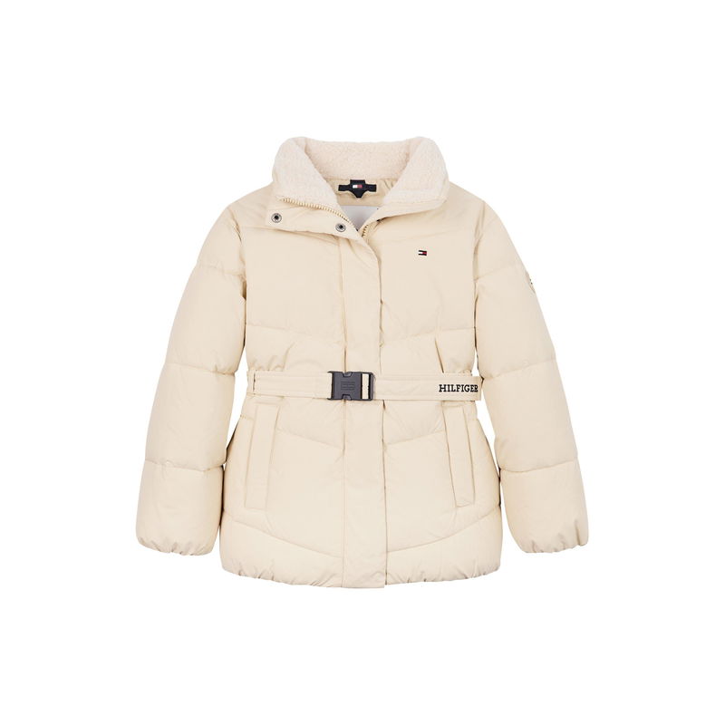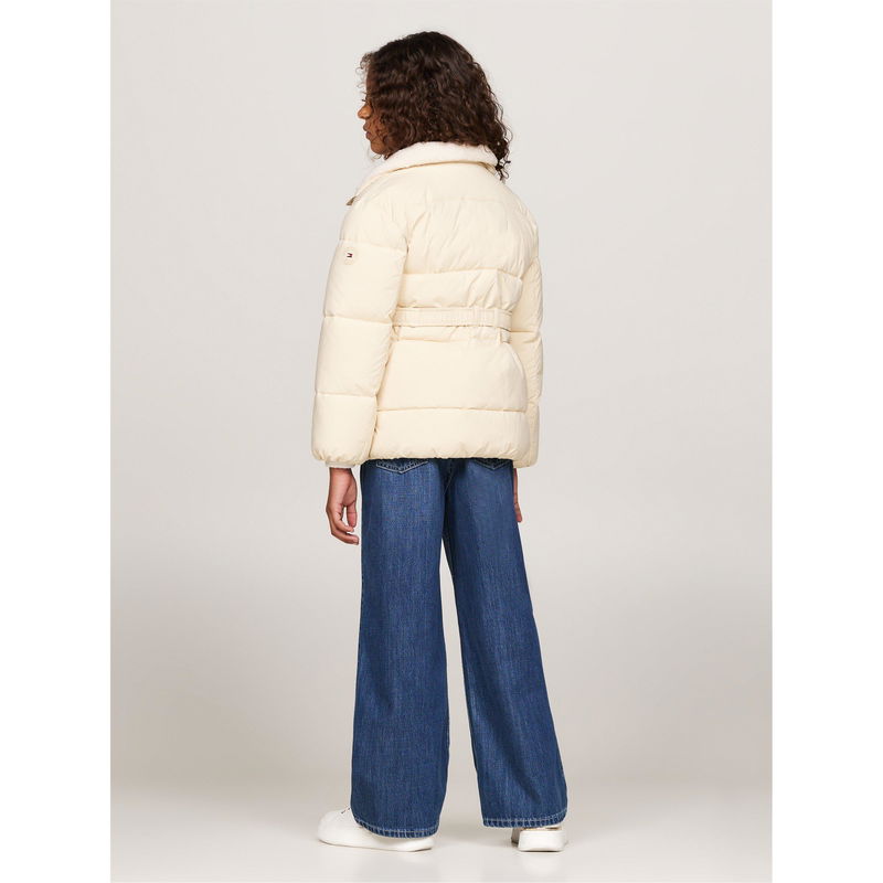 The Teddy Collar Belted Puffer Jacket from Tommy Hilfiger offers warmth and style for children with its oversized fit and wind-resistant design. This essential outerwear piece features quilted padding and a plush collar, securing with a zip fastening and includes a belt for a customisable fit.