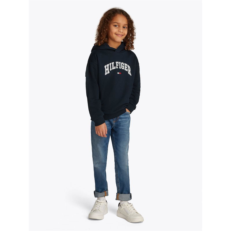 Tommy Hilfiger's Kids' Varsity Hoodie embodies classic American aesthetics. This sweatshirt is characterised by soft fabric with structured trims for a secure fit that provides warmth while maintaining its shape.