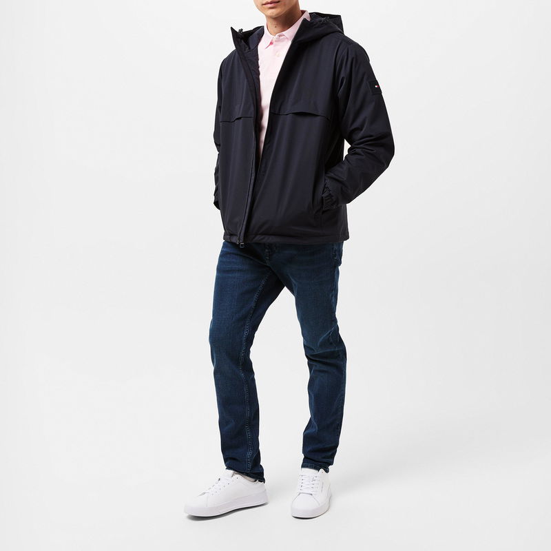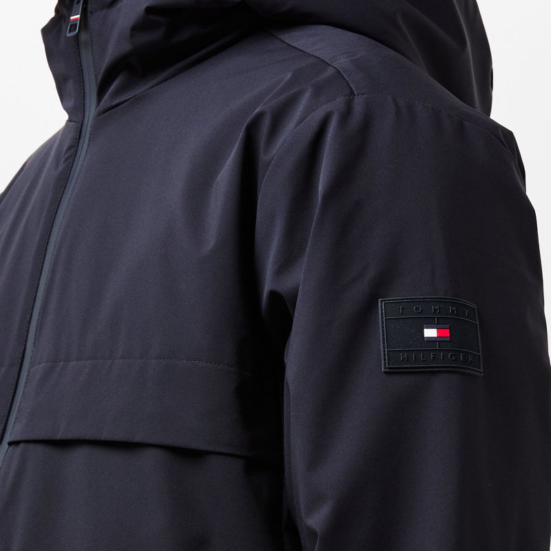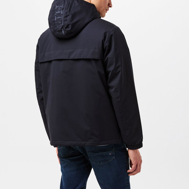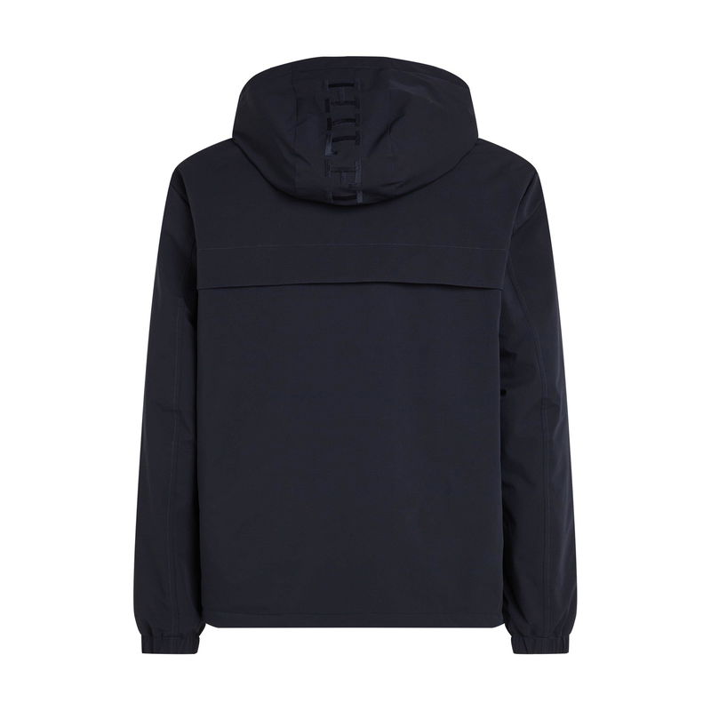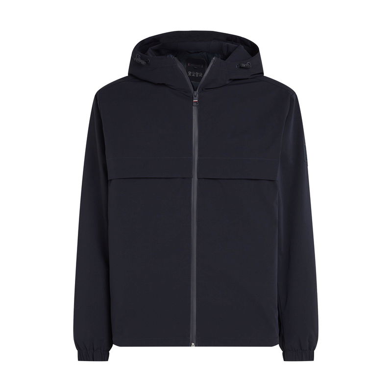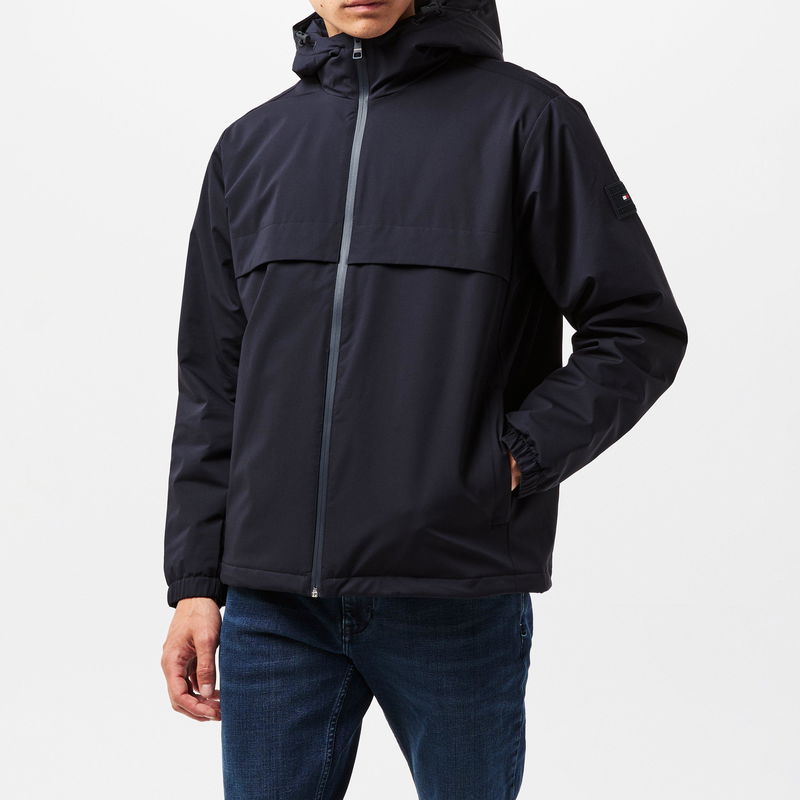 The Tommy Hilfiger Men's Technical Hooded Windbreaker delivers lightweight protection with athletic appeal. This coat features a sleek design that transitions easily between casual and active settings, offering both durability and comfortable stretch for unrestricted movement.