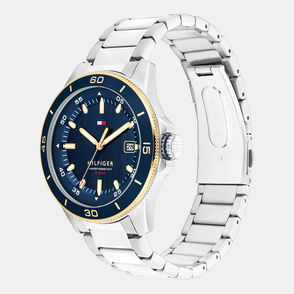 Statement, sturdy and suave, this Tommy Hilfiger Riley watch makes a great complement to the wrist. The dial is organised by slim and contrasting index hour markers and surrounded by a ring in the brand's signature tri-colour logo. A small logo is placed at the three o'clock mark. The watch is finished with a reliable folding clasp.