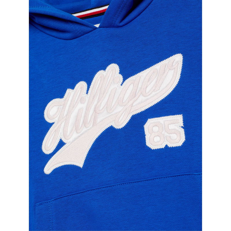 Treat your little one to the timeless style and accessible luxury of Tommy Hilfiger, introducing the Script Logo Hoodie Juniors, a perfect blend of contemporary fashion and sustainability. Crafted from a recycled cotton blend, this hoodie embodies our commitment to creating stylish pieces with a conscience. With its relaxed fit and dropped shoulders, this hoodie offers comfort alongside the cropped elasticated trim that adds security and character to the design. With a hooded neck and ribbed cuffs, this hoodie offers warmth and durability perfect as a layering piece in the winter months. The kangaroo pocket provides a convenient and stylish storage option for your little one's essentials. Adding an extra touch of distinction, our iconic flag is expertly embroidered on the hood, while a statement script logo adorns the chest, showcasing the brand's rich heritage. Whether you're relaxing on a family getaway or embracing casual elegance during daytime activities, this hoodie is the perfect companion for your youngster.