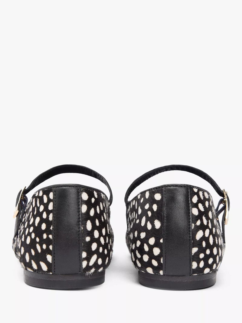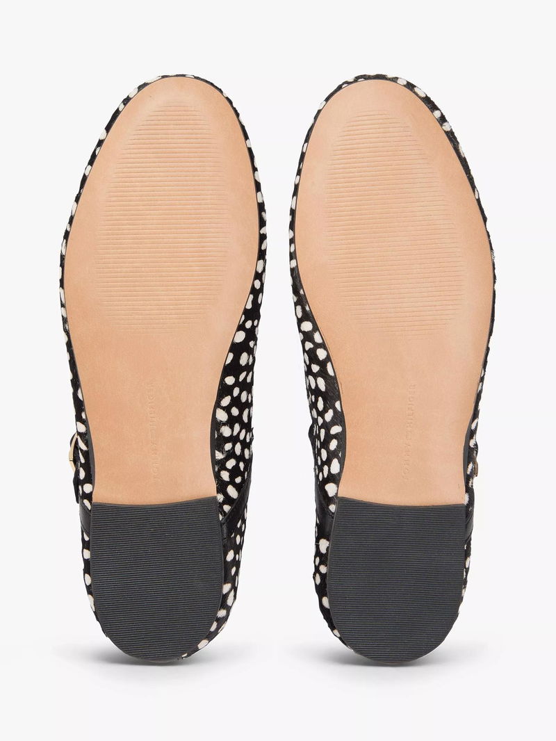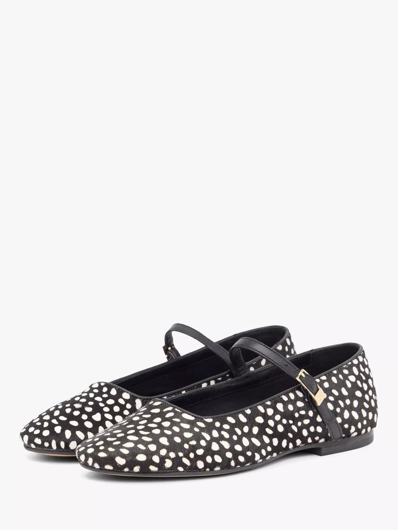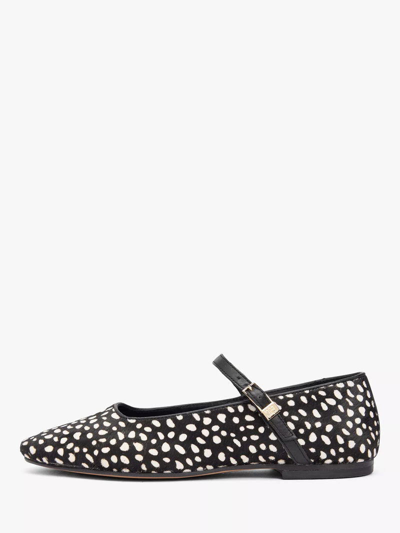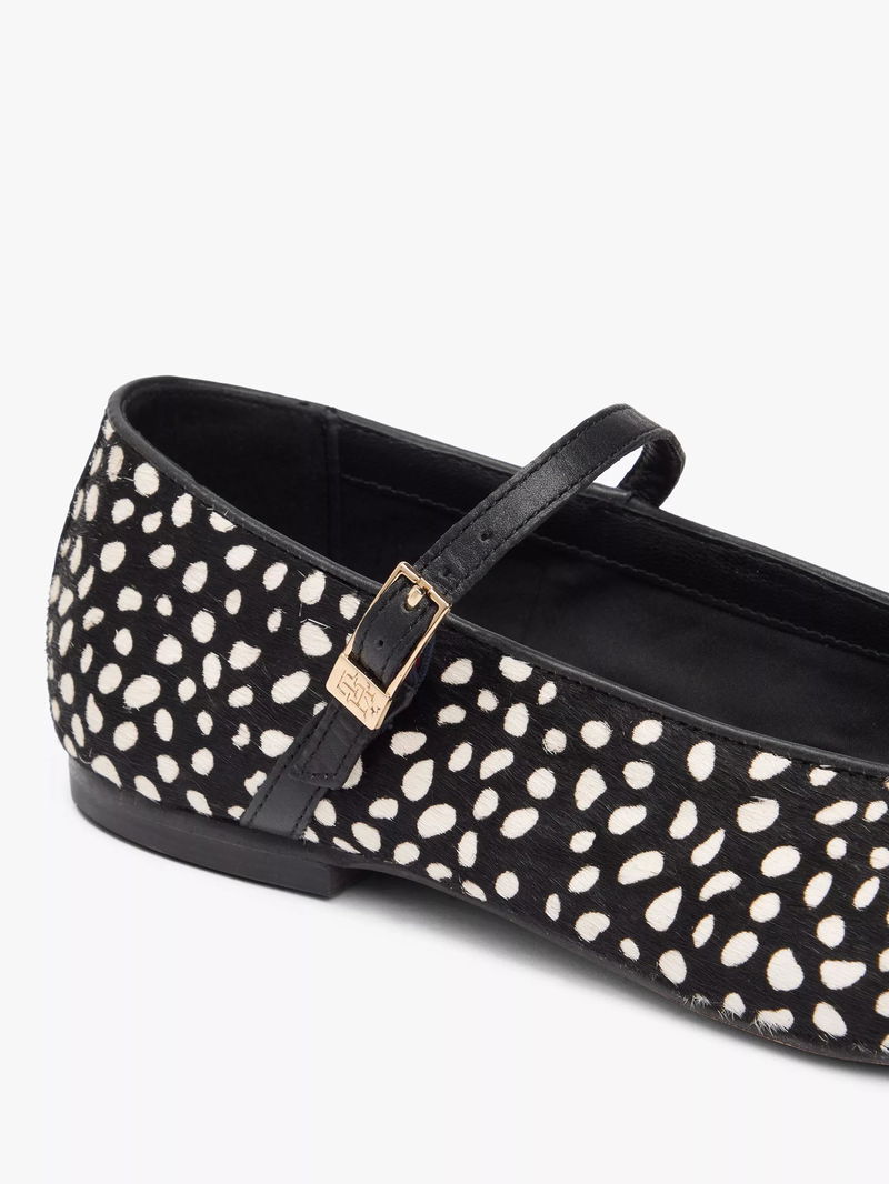 These ballerinas are made from printed calf hair and combine a striking snow leopard design with a strap and TH monogram buckle.
