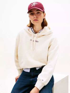 Tommy Hilfiger's Script Hoodie delivers everyday comfort with designer branding. This casual fashion pullover sweatshirt features a relaxed fit with a drawstring hood and ribbed trims for a classic sporty finish.