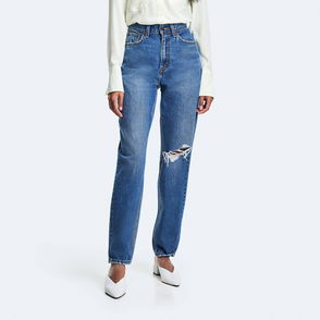 Regular mom fit High rise Belt loops Concealed fly Five pockets Logo details to front and back.