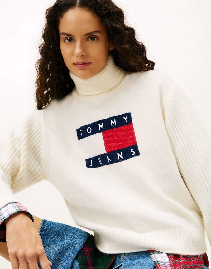 Tommy Flag Intarsia Relaxed Turtleneck Jumper In Beige