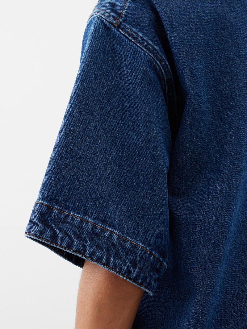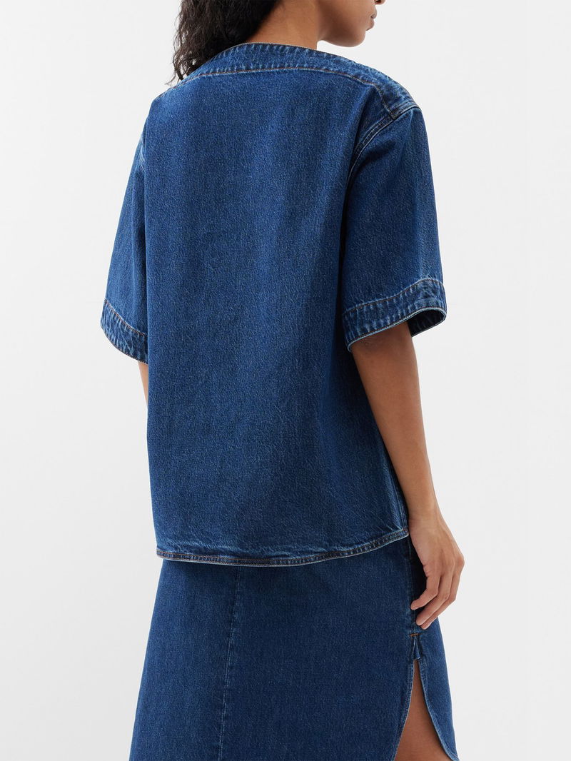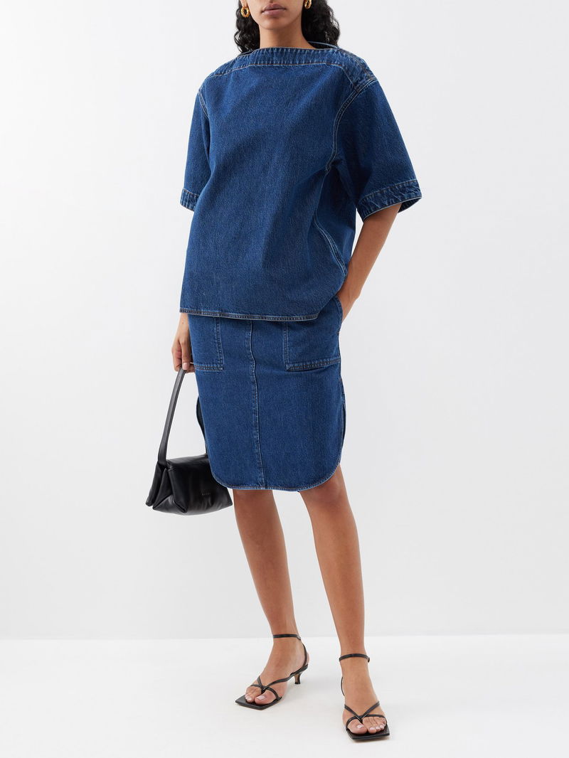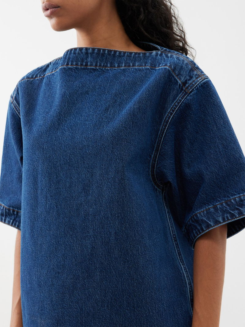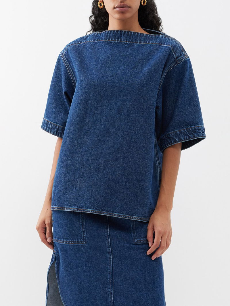 Toteme reimagines denimwear with this indigo-blue boat-neck top, crafted in Italy from softly structured organic cotton with classic tobacco topstitching.