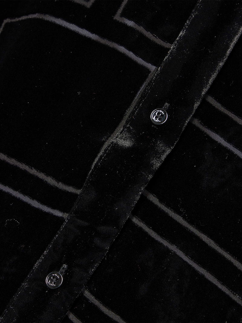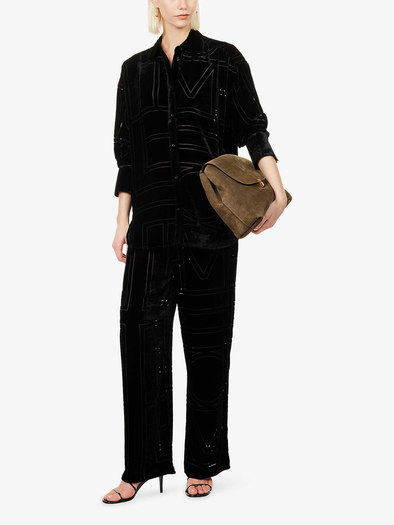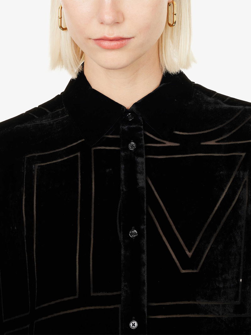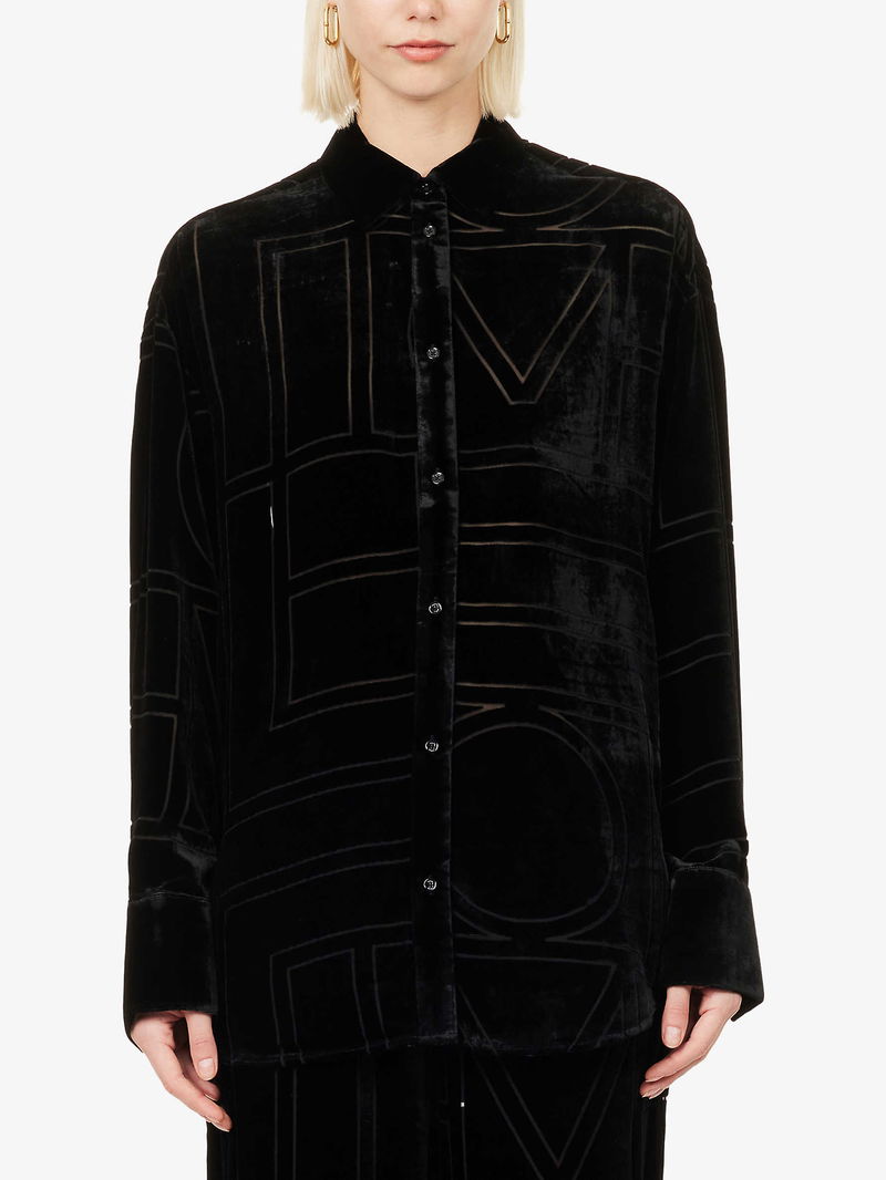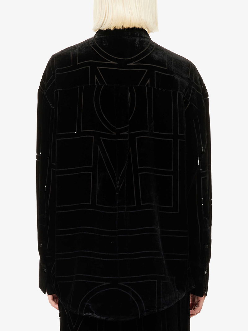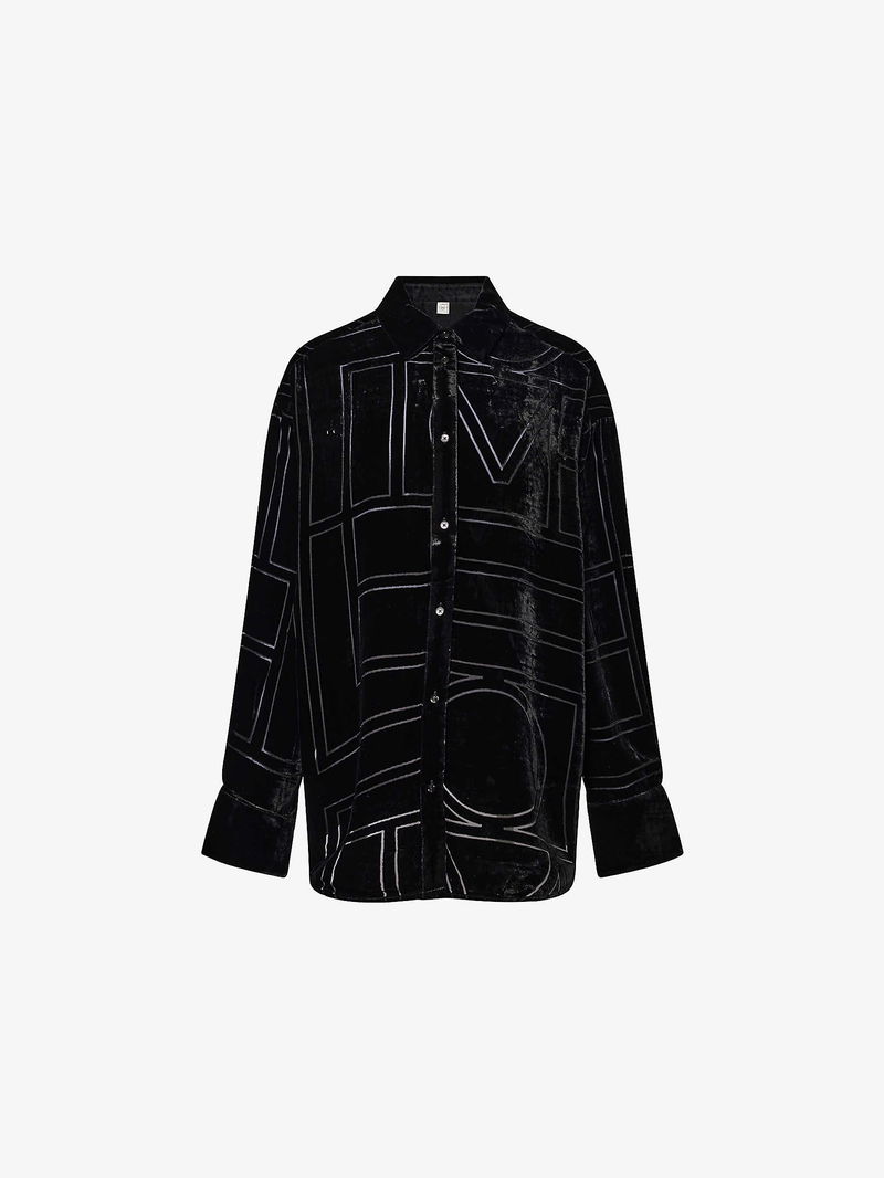 Totême silk-blend shirt. Button fastening. Relaxed oversized fit, classic collar, dropped shoulders, buttoned cuffs, all-over devoré monogrammed print, curved hem.