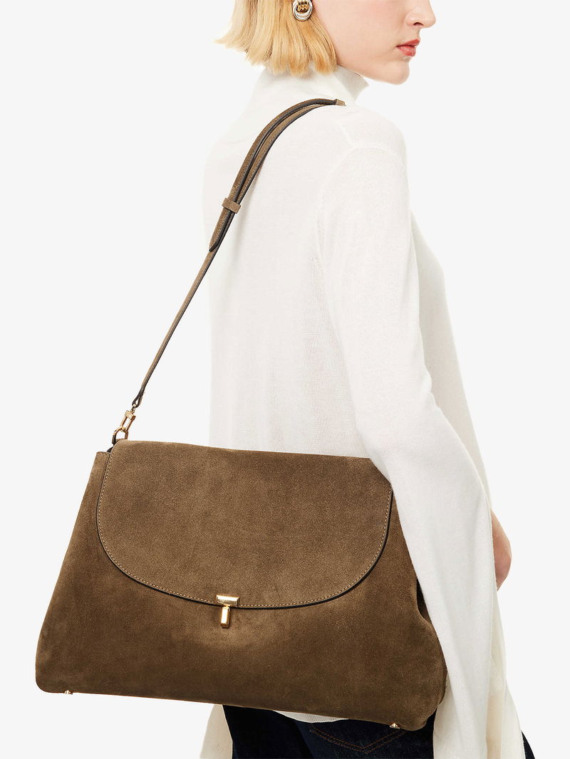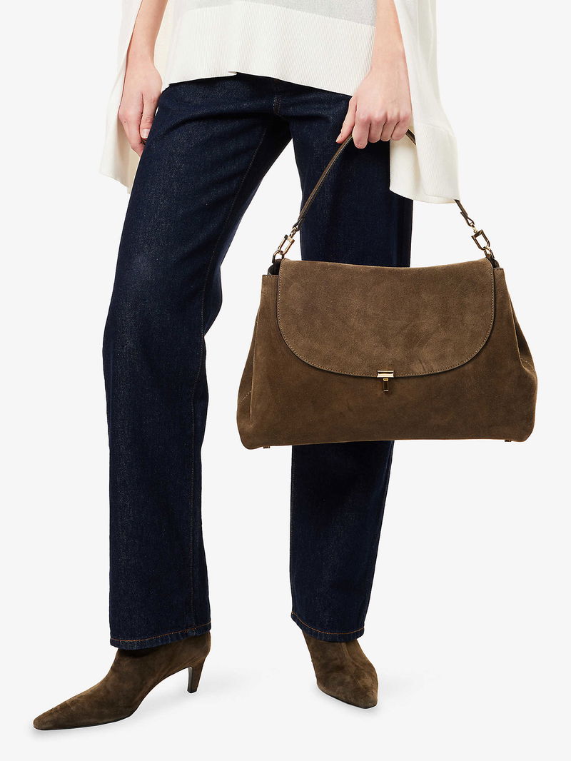 TOTEME suede top handle bag. Top handle, detachable and adjustable long strap, flap font, four protective feet at base, gold-toned hardware, one main compartment, two internal slip pockets and foiled branding, fully lined.