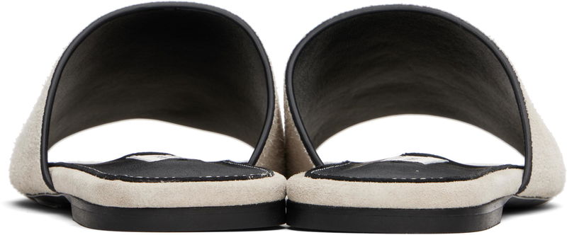 LWG-certified suede sandals in gray. Open square toe. Logo patch at grained leather footbed. Rubber heel. Polished leather sole.