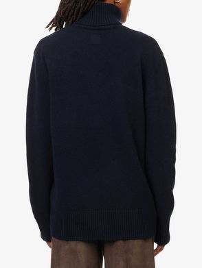 Long sleeve brushed wool and cashmere-blend sweater in off-white. Rib knit turtleneck collar, cuffs, and hem.