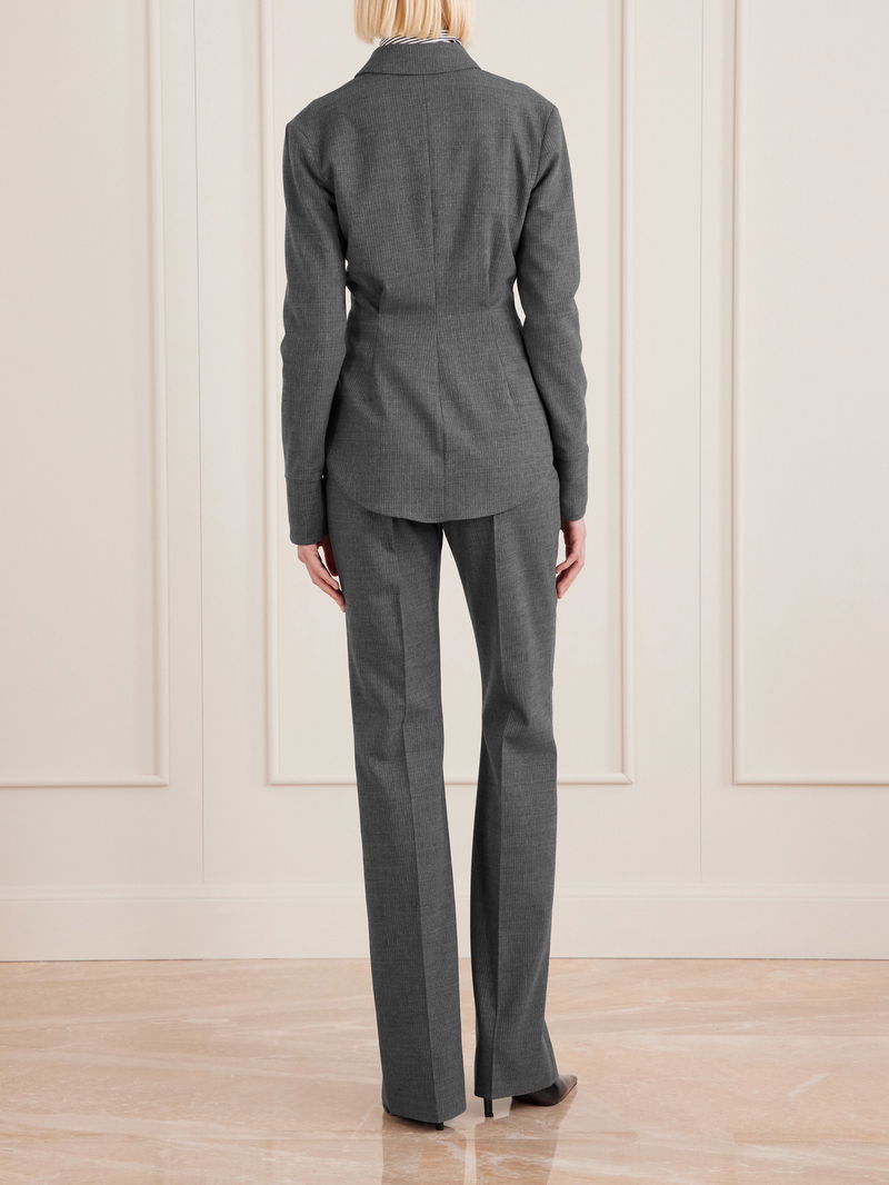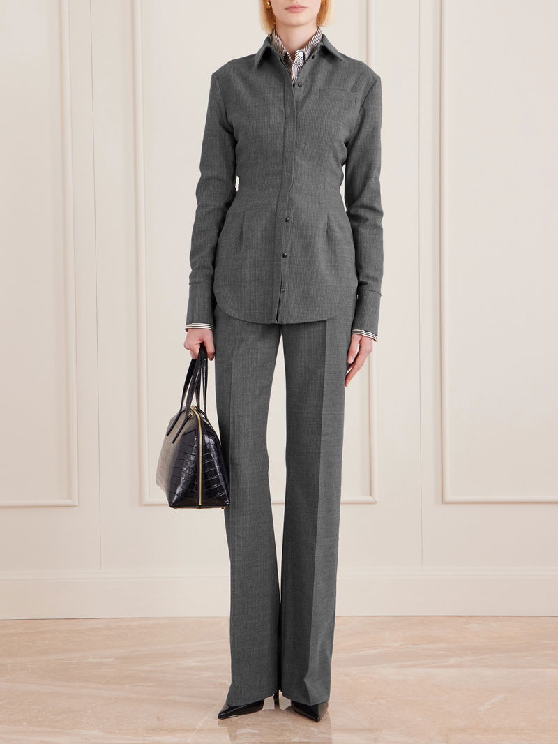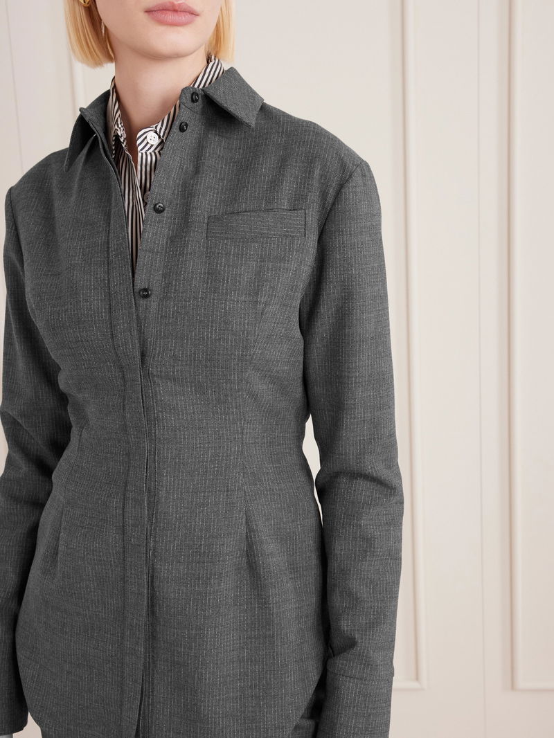 TOVE's 'Elvin' shirt is minimalist and modern. Made from a textile that's woven with wool for weight and drape, it has concealed fastenings and darting to subtly draw in the waist.