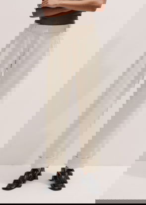 Tapered pants, Twill, Pressed creases, Two side slit pockets, Two back welt pockets, High-rise cut, Concealed hook, button and zip fastening at front, Mid-weight, non-stretchy fabric.