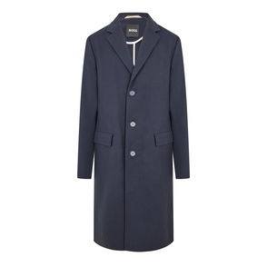 Virgin wool twill jacket. Self-tie fastening at front and interior side seam for alternate styling.