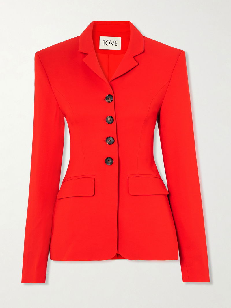 Expertly tailored for a sculpted shape, TOVE's woven 'Merl' jacket delivers a modern take on formal dressing. It's designed with lightly padded shoulders, notched lapels and contrasting horn buttons. Pair yours with the coordinating 'Drew' pants.