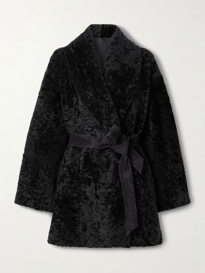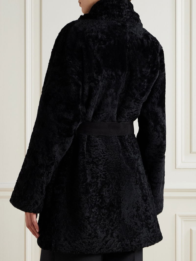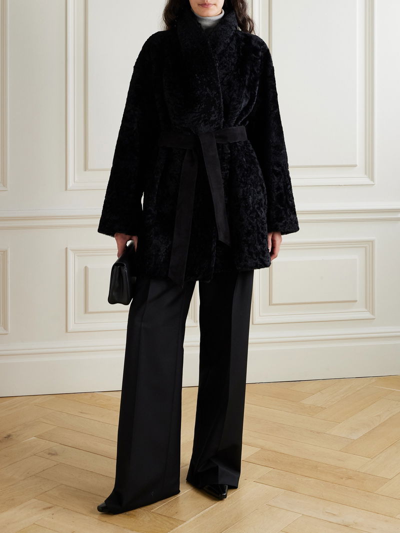 TOVE's 'Vanessa' coat is made from luxurious shearling. It has wide shawl lapels and ties with a belt to define your waist.