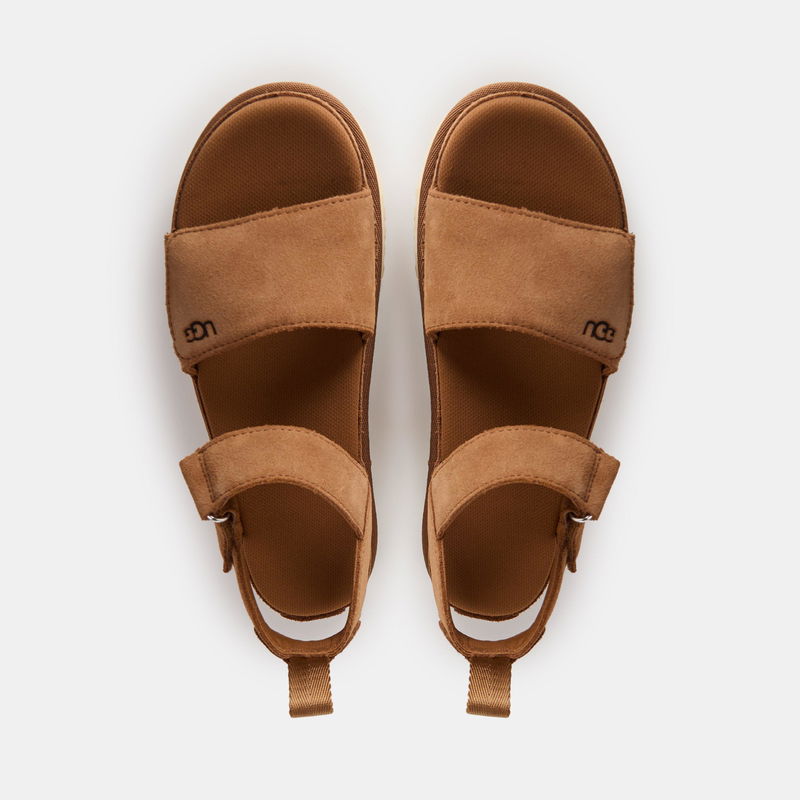Step into summer in style with these Goldenstar Sandals by Ugg. Perfect for those warmer days,these sandals are expertly crafted with a sumptous suede upper and Sugarcane EVA foam-infused footbed, midsole, and outsole, achieving a silhouette that is breathable, durable and stylish, perfect for those sunnier months. Made with your comfort in mind these open toe sandals boast comfort and confidence in each step with adjustable ankle and vamp strap, adorned with the iconic UGG graphic, and their convenient hook-and-loop closure, creating a personalised fit.. Elegance becomes this pair, with their chic colourway, elevated by the heat-embossed Ugg logo on the strap, making them easy to style with your favourite summer outfit. Composition: Rear pull tab made from 100% recycled polyester fibers.Textile lining made from 100% recycled polyester fibers Sockliner textile made with 100% recycled polyester.Contoured EVA footbed.Sugarcane EVA midsole made with recycled EVA regrind. Recycled polyester binding.