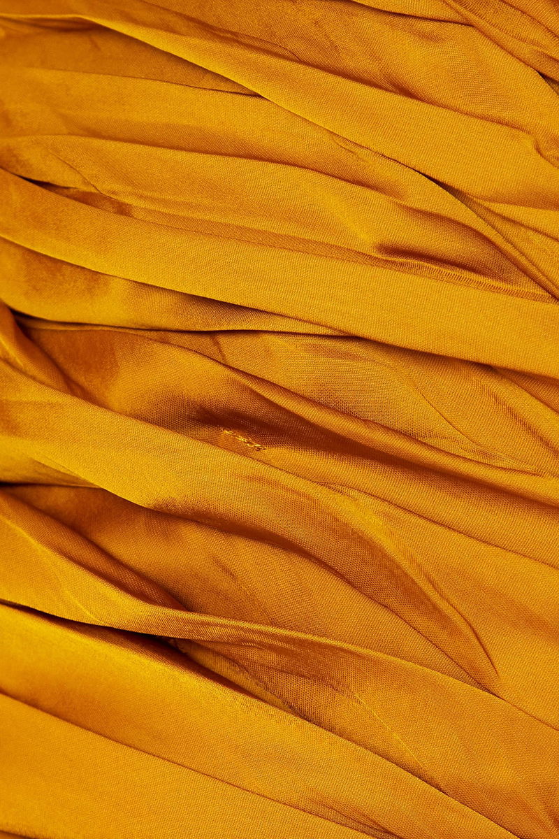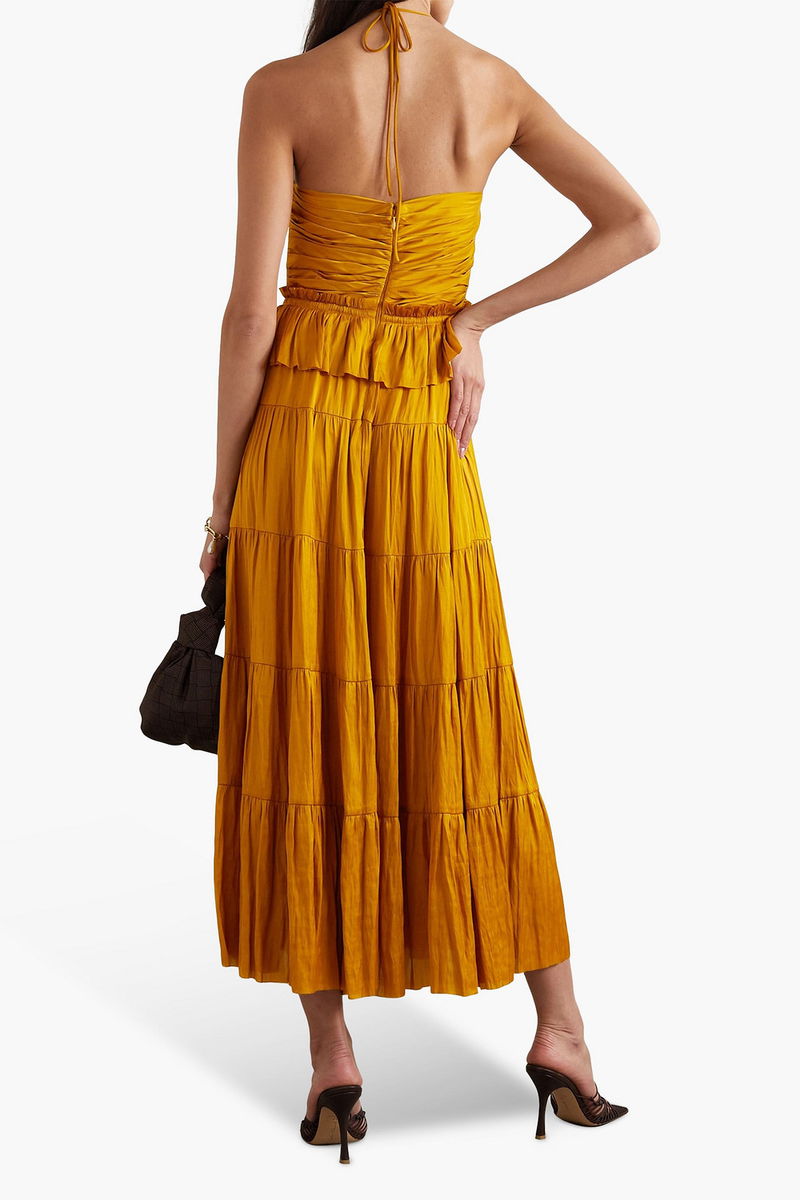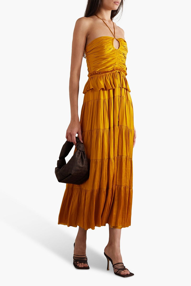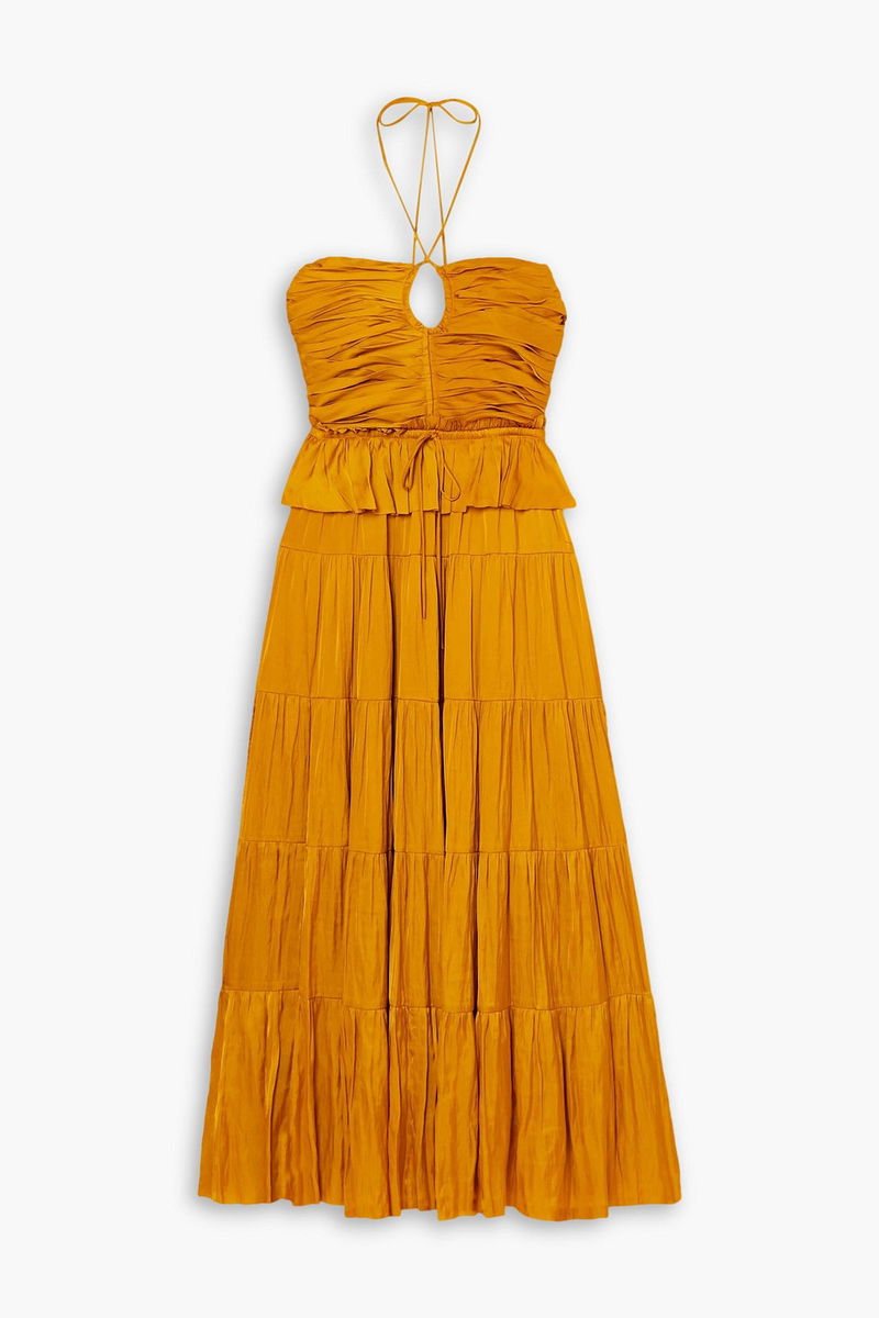 Cold-shoulder dress, Satin, Pleated, Ruffled, Gathered, Drawstring waist, Ties at neck, Concealed hook and zip fastening at back, Internal boning, Non-stretchy fabric, Mid-weight fabric.