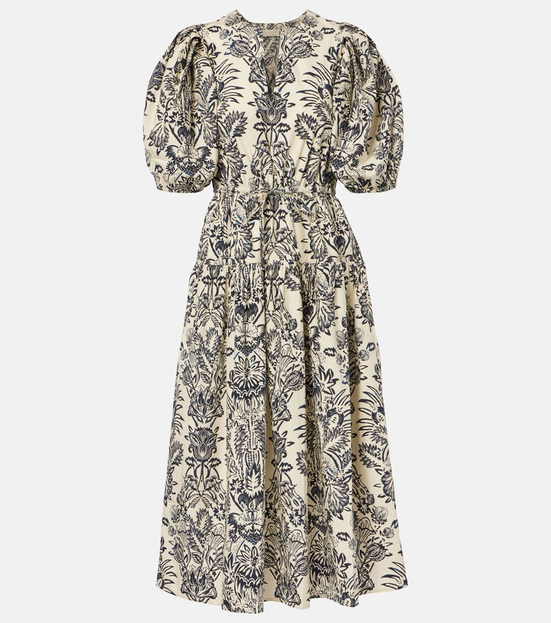 The Harriet dress from Ulla Johnson is cut from cotton poplin to a midi-length silhouette and decorated with a tactile botanical print. This design is complemented by elegant puff sleeves and an elasticated drawstring waist.