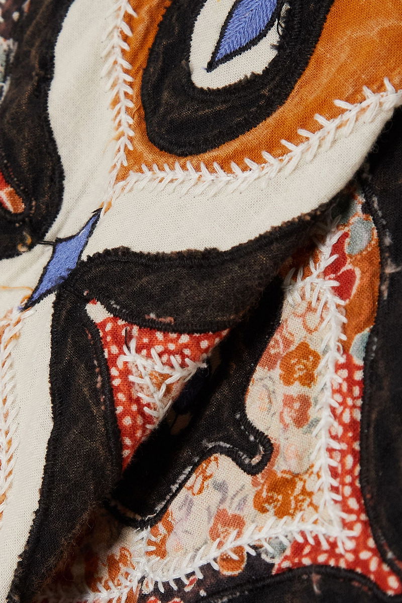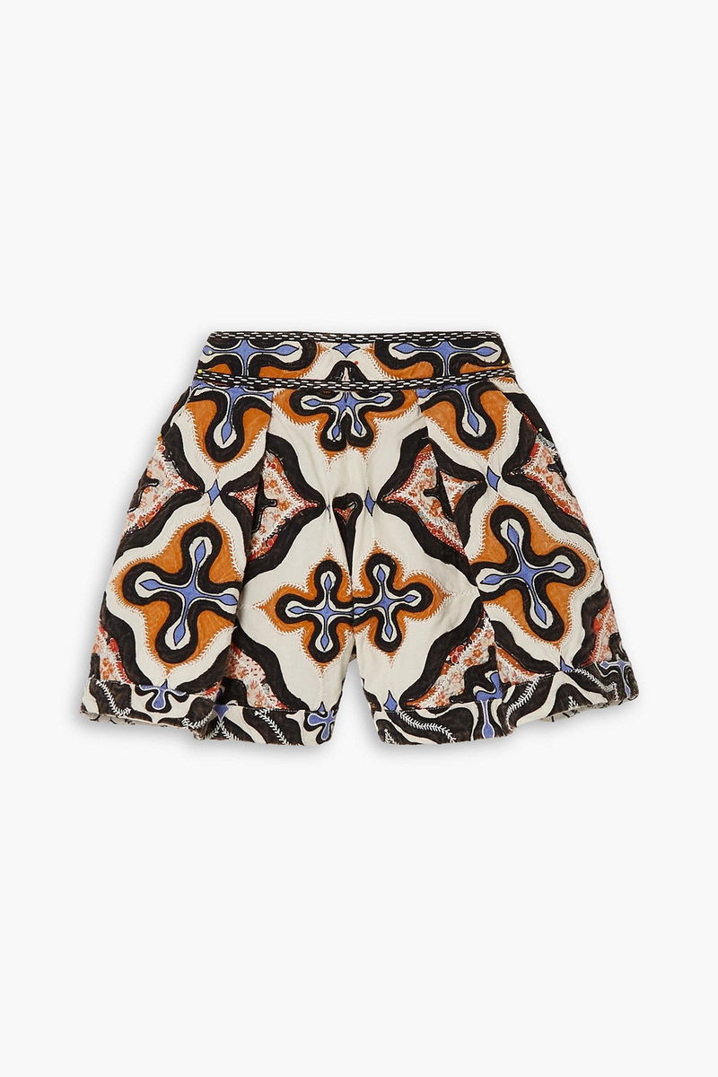 Printed cotton embroidered shorts. Pleated, high-rise cut, two side slant pockets, concealed hook and zip fastening at back, non-stretchy, mid-weight fabric.