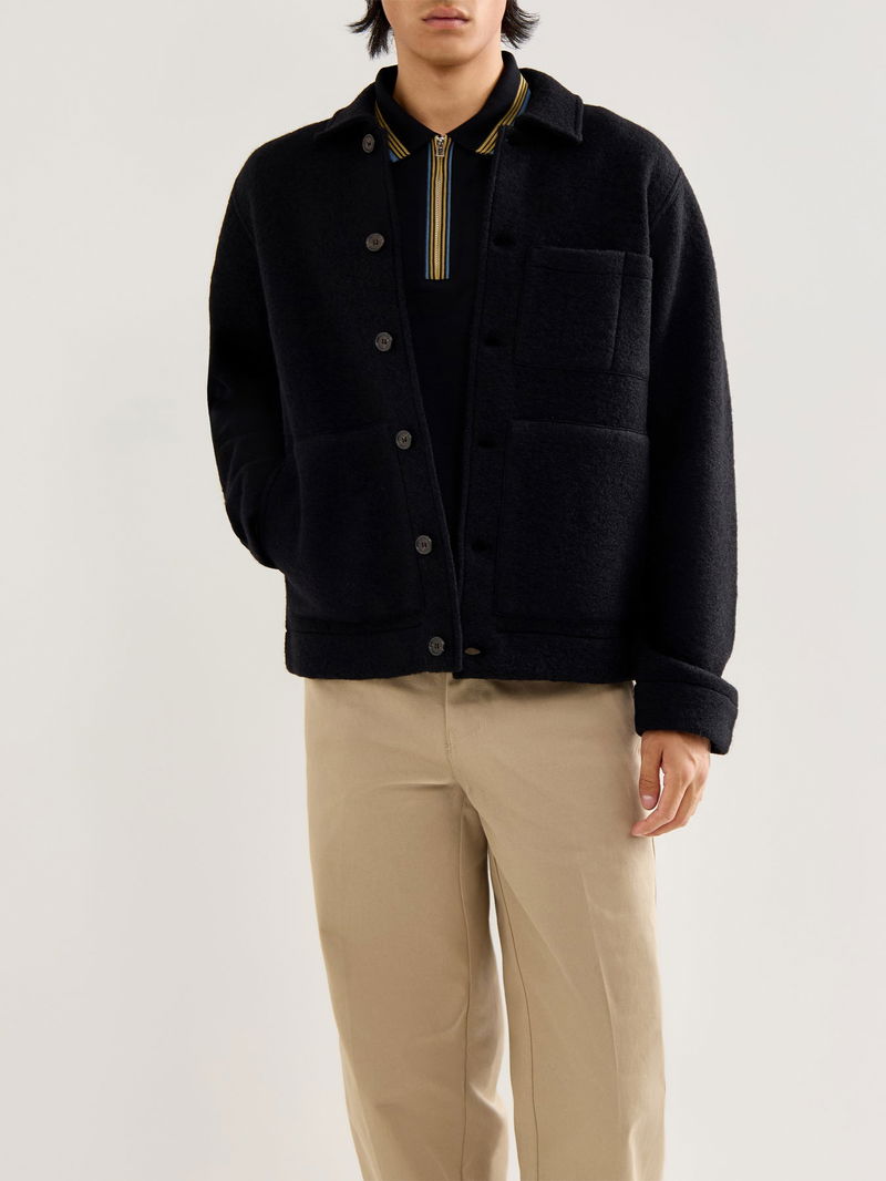 This black wool jacket offers a classic silhouette crafted from high-quality wool for lasting warmth and comfort. Its versatile design makes it suitable for both professional settings and casual wear, providing a polished look while keeping you cozy in cooler weather. Durable and stylish, this jacket is a practical addition to any wardrobe.