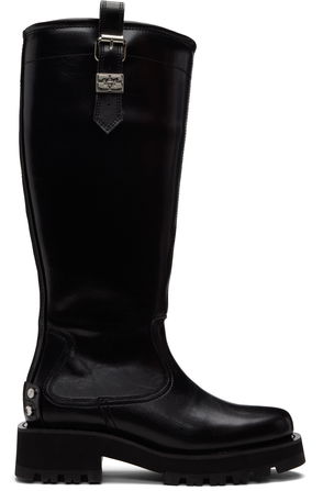 So sleek and sophisticated, these minimalist leather boots are featured in a tall style with an angular square toe. Pull-on style, knee-high length, smooth leather fabrication, square toe, slight block heel, elastic inlays, inner zipper closure. The square toe on these classic boots gives them a cool, edgy update.