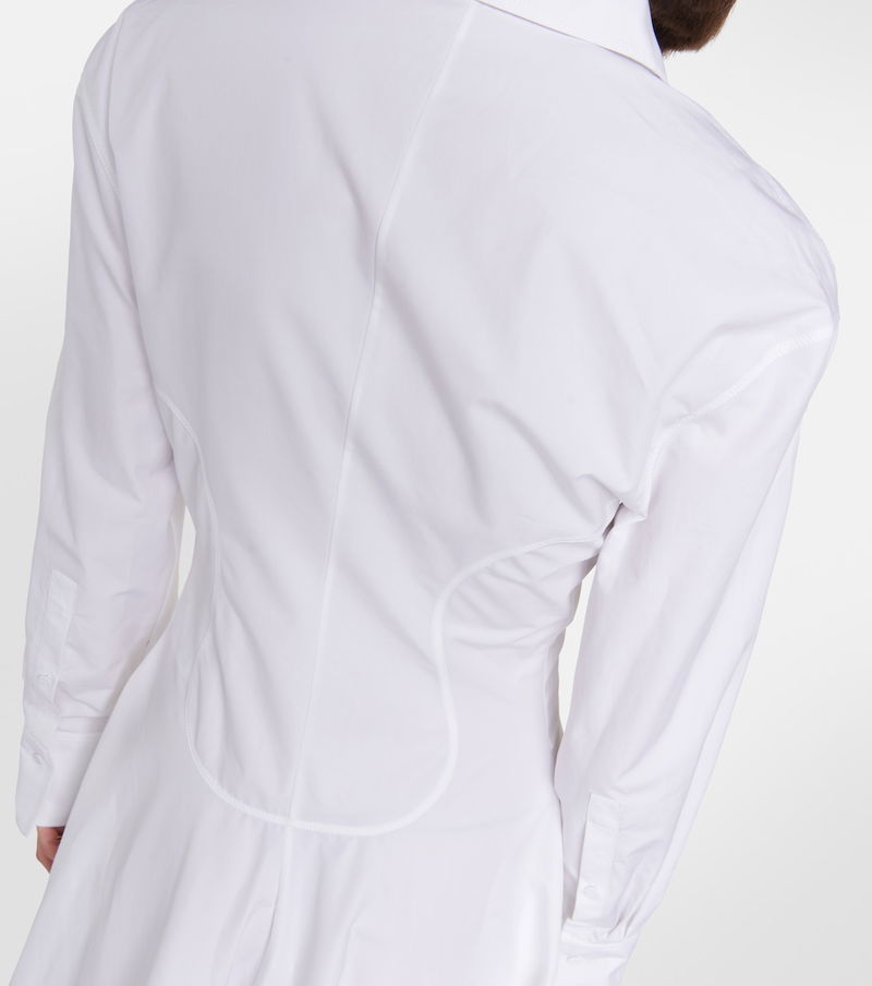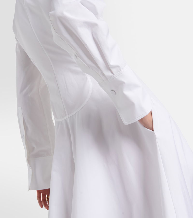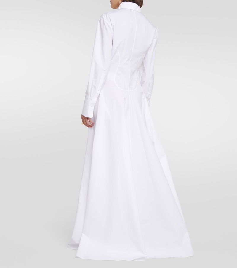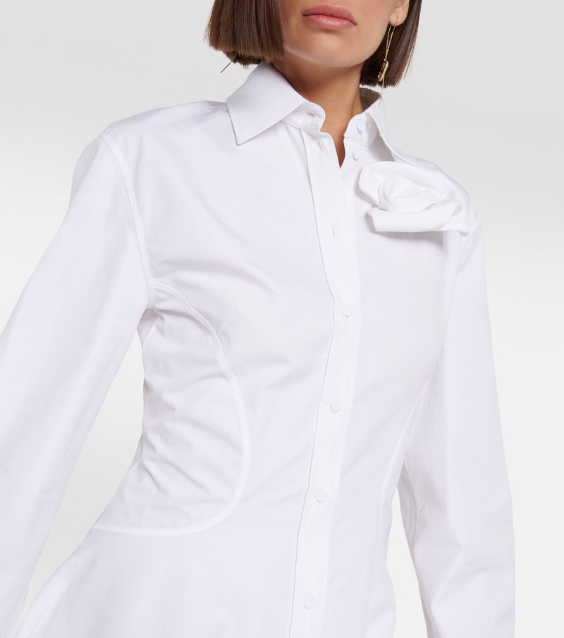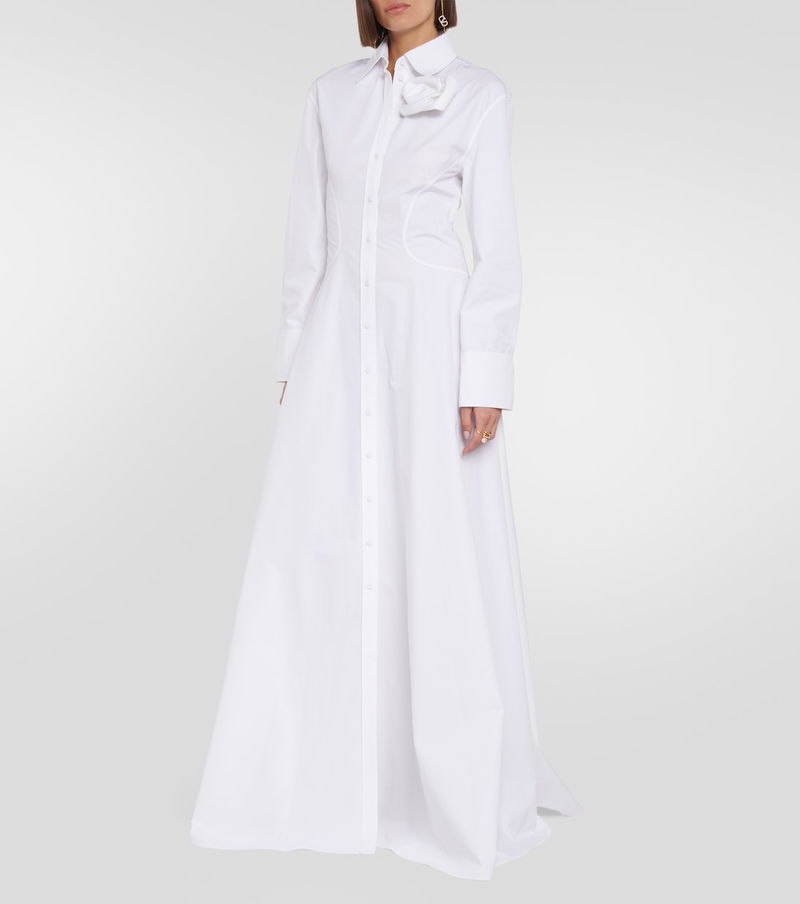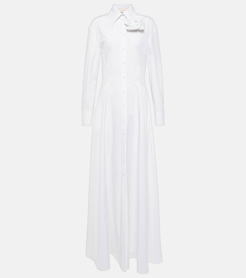 Artfully detailed with a gathered appliqué rosette to the point-collar neckline, this tailored gown from Valentino is cut from white cotton poplin. The long-sleeved style has tailored elements, including voluminous cuffed sleeves and a buttoned placket.