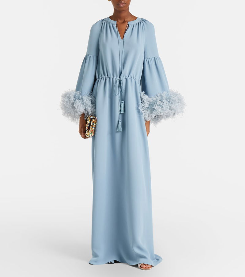 Exude timeless glamour in this gown from Valentino. The floor-length piece is crafted from the signature silk Cady Couture fabric into a flowing silhouette with feather trims and an adjustable drawstring at the waist.