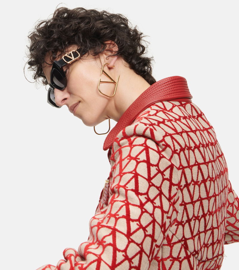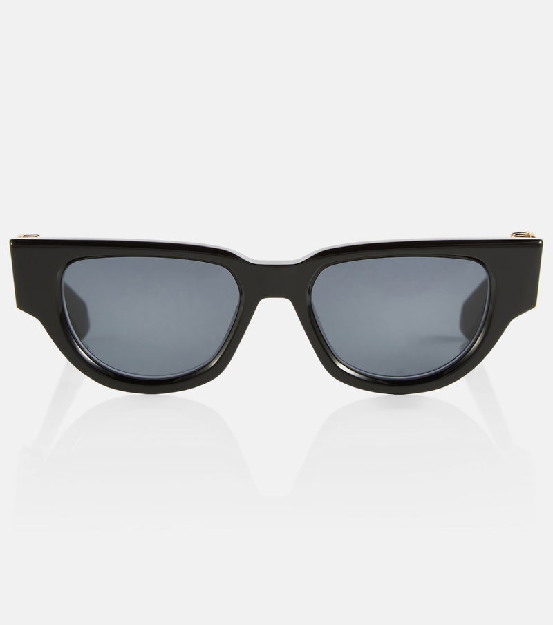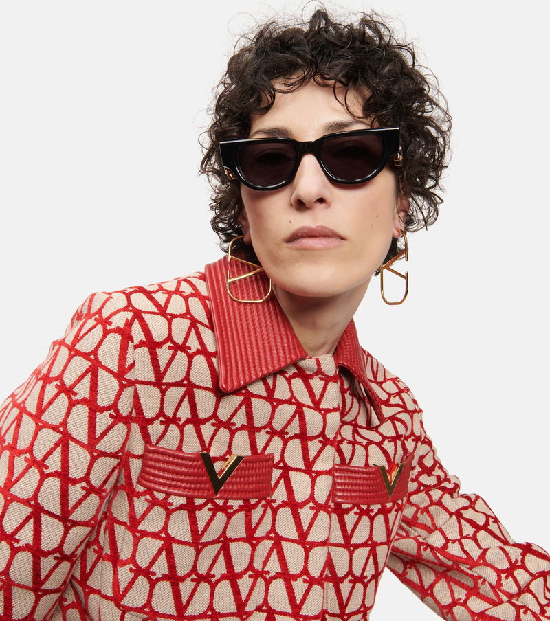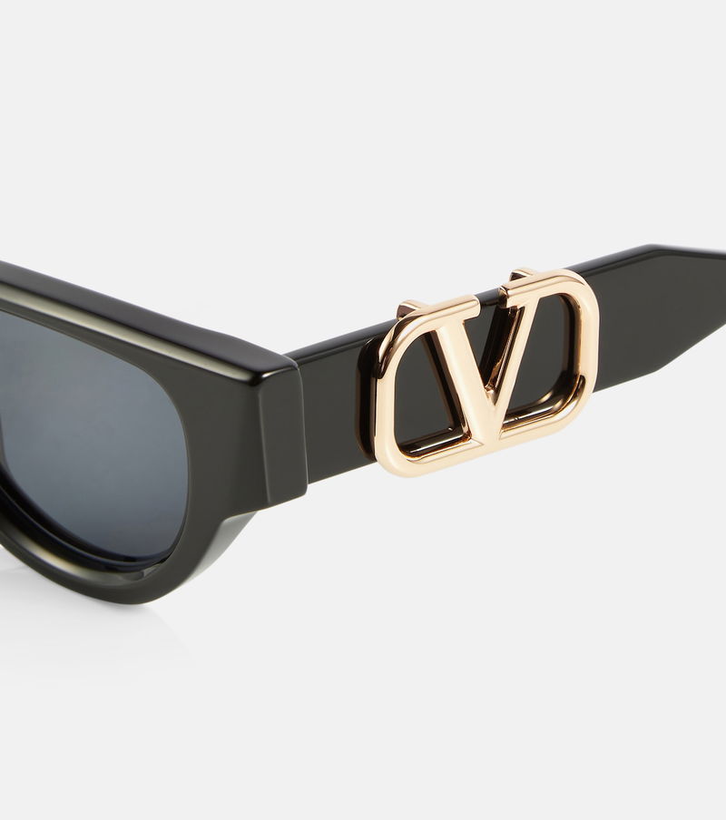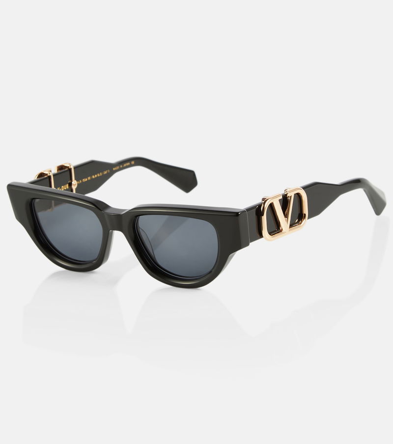These Valentino sunglasses have a contemporary cat-eye silhouette. They're made from acetate with black frames and dark gray lenses.
