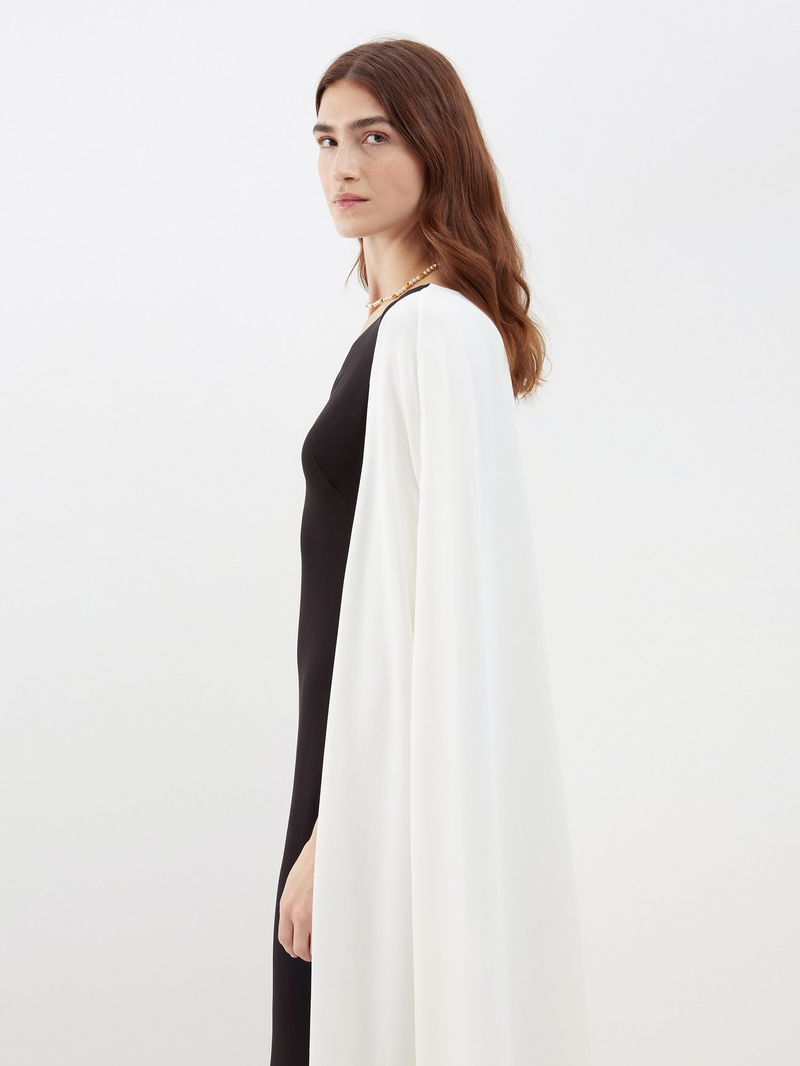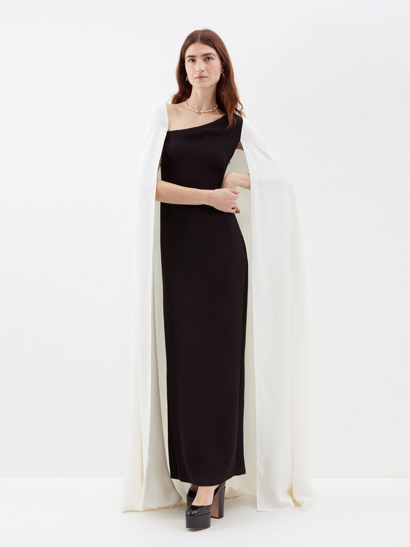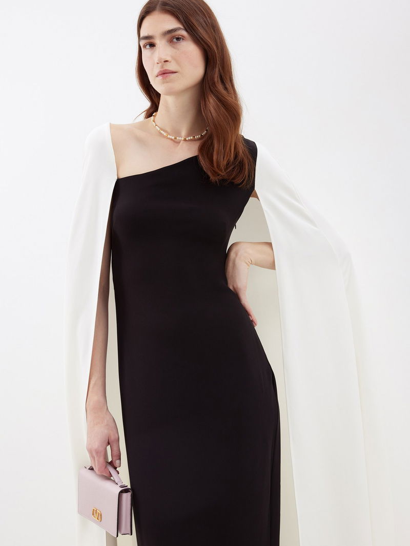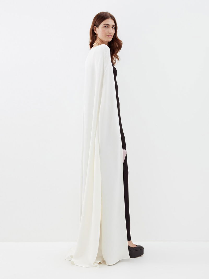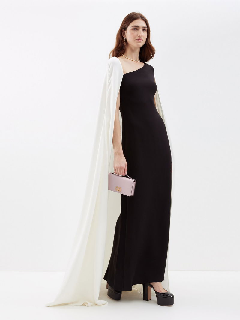 Valentino Garavani looks to suiting to inform its AW23 collection, and this black and white caped-shoulder cady gown subtly nods to monochromatic sartorialism.