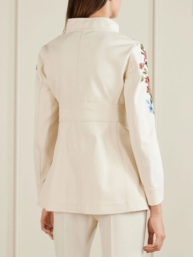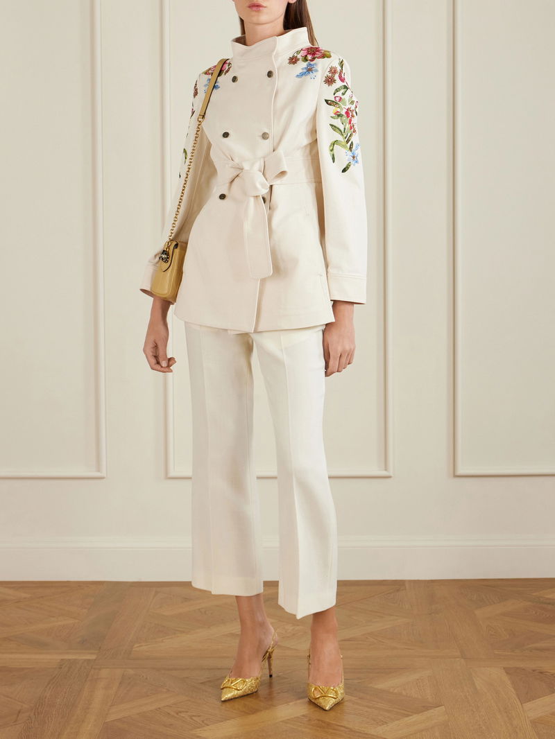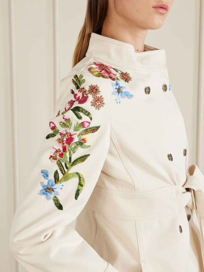 Valentino Garavani's jacket is brought to life by the beautiful floral embroidery tracing the sleeves. Made from denim, it has a double-breasted front with a stand collar and self-tie belt to define your waist. Clusters of sequins lend a hint of sparkle.