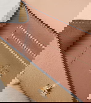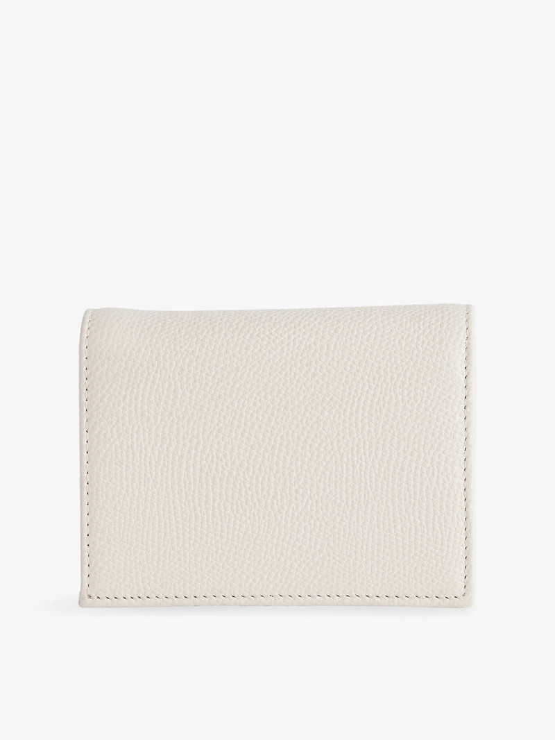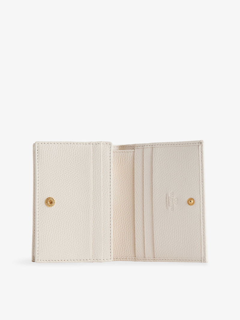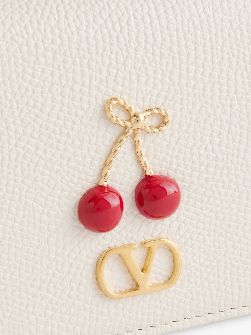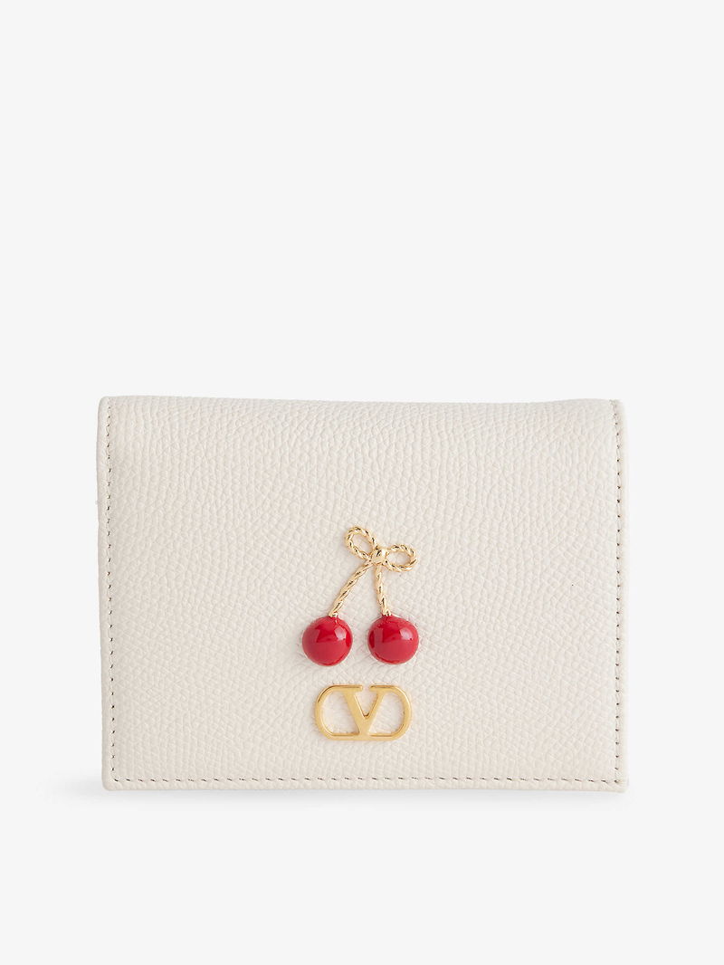 Valentino leather wallet. Flap front, enamel Cherry decoration, antique brass-finish hardware and logo, five card slots and one slip pocket, one zip coin pocket and one banknote pocket.