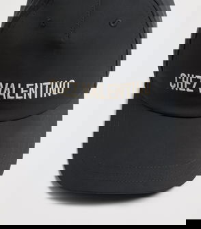 This baseball cap leaves no doubt as to its heritage. The bold V is embedded within a negative block, proudly announcing its House of origin. As if to drive the message home, "chez Valentino" is embroidered below, loosely translating from French to "at the house of Valentino. " Why French? The Paris/Rome beneath the phrase offers a hint.