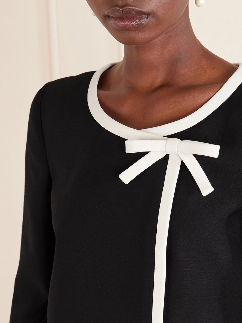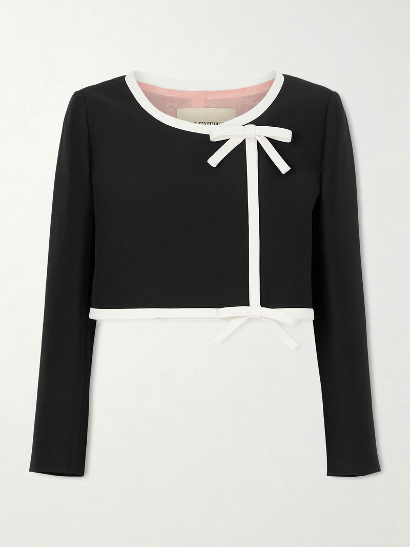 Romantic yet refined, Valentino Garavani's jacket reimagines classic tailoring. Made from smooth wool and silk-blend, it's defined by a cropped silhouette, contrasting trims and a delicate bow accent. Pair yours with slim pants to keep the look effortlessly elegant.