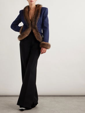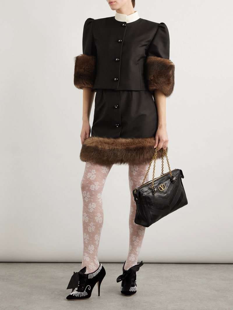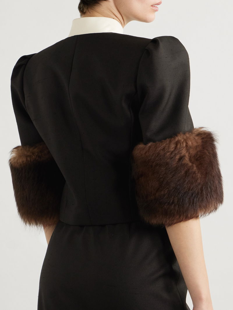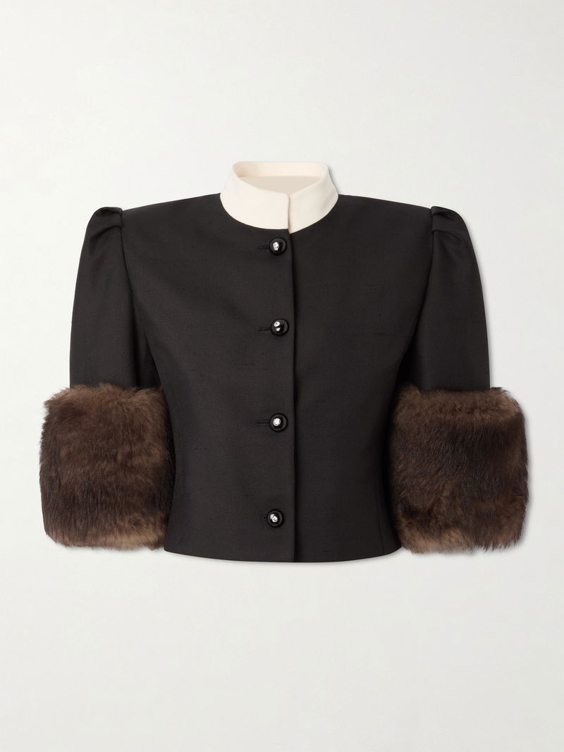 Made from silk in a cropped shape, it's traced with plush shearling and has crystal-encrusted covered buttons.