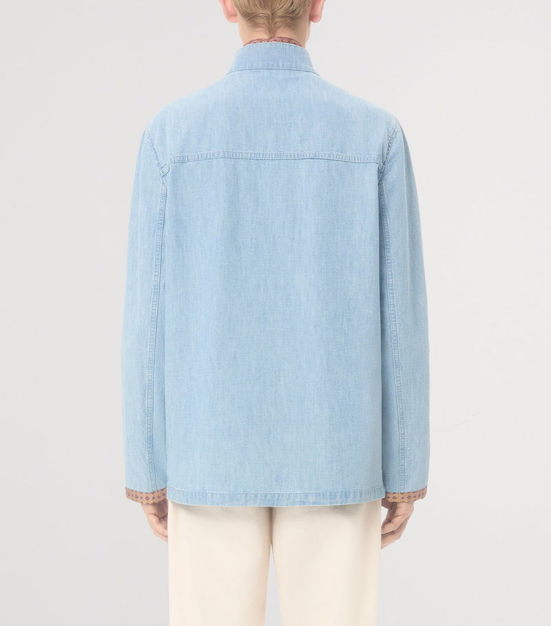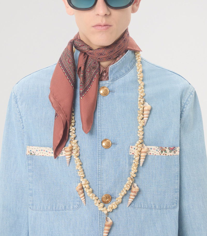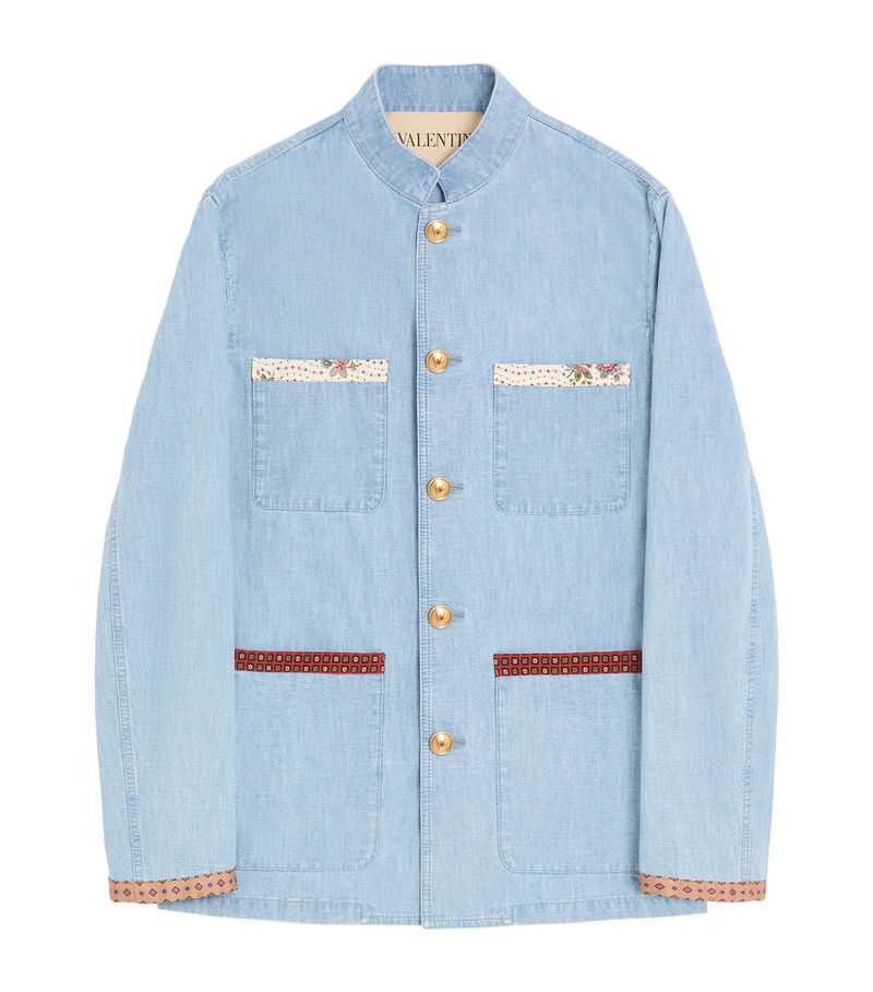 This Valentino denim safari jacket elevates a casual staple through the lens of traditional Italian tailoring and vibrant, artisanal accents. The light-wash denim is distinguished by a sophisticated stand collar and a series of ornate, burnished metallic buttons that lend a regal, authoritative air to the clean-lined and structured silhouette.