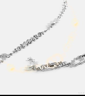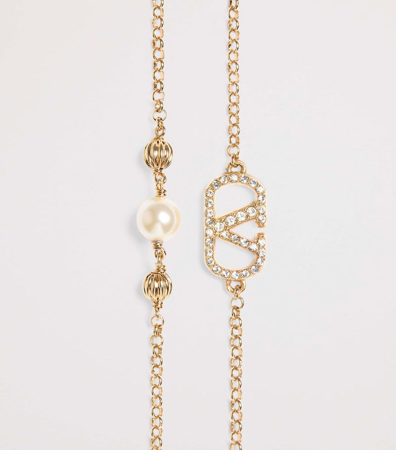 Nothing captures timeless elegance quite like a set of luminous pearls, and this bracelet from Valentino Garavani embodies that very allure. A halo of iridescence encircles the wrist, crafted from lustrous faux pearls and scintillating Swarovski crystals, each linked by the gentle warmth of a gold-tone double chain. Finished with the House's instantly recognisable, embellished V logo, it offers a classic touch of Valentino sophistication.