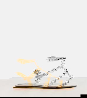 Sandals, Leather, Braided, Open round toe, Slight heel, Ties at ankle, Leather sole.