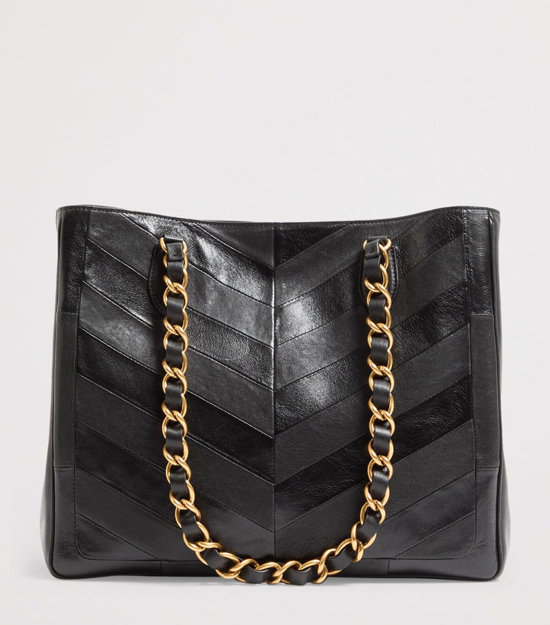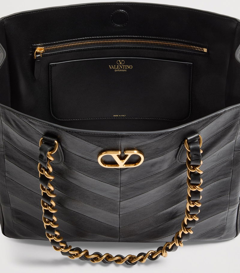 Meet Valentino Garavani's latest contender for the it-bag of the season - the Laseine tote. Falling in line with the House's refined vision, this design is characterised by its leather-interlaced chain strap and artful chevron patchwork that beautifully complements the gleaming VLogo standing centre-stage on the front.
