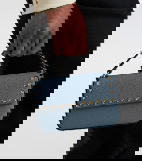 Valentino Garavani reimagines its mini top-handle bag in gleaming metallic leather, letting the surface catch and play with the light from every angle. The compact silhouette remains purposeful and easy to carry, while signature rockstuds trace the edges with sharp, architectural definition.